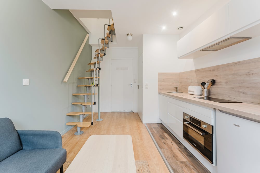 The apartment is located on the third floor of a secure residence (no elevator), so you'll have access to the entire dwelling. It's a duplex apartment with the bedroom on the first floor, which is very quiet, but the staircase (see photo) is not suitable for a family with small children or for people with mobility problems (see photo), so we recommend you take this into consideration. We appreciate this apartment for its location and charm. Fully equipped, it comprises a living room with fully-equipped kitchen, upstairs a bedroom with a comfortable double bed, an en-suite bathroom with shower and washing machine, and a separate toilet. The apartment will be carefully prepared for your arrival: Professional cleaning service + laundry service for household linen. All linen is provided: bed linen, bath towels, bath mats and tea towels. The kitchen is equipped with all utensils and dishes for breakfast and dinner. Entertainment available via TV: Molotov TV, Prime Video! Ideal for a stay for two, alone or on a business trip.