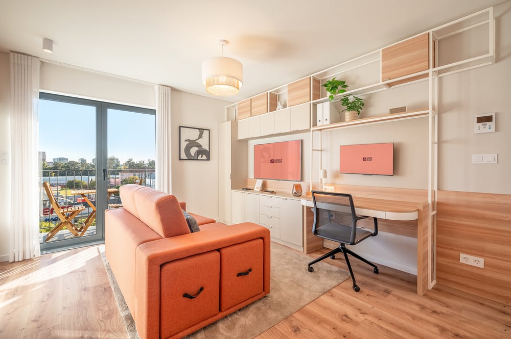 Welcome! This modern 43 m² apartment, elegantly decorated and part of an exceptional project, will provide you with a stay full of comfort, tranquillity, and convenience. The open-concept design harmoniously combines the living, dining, and kitchen areas. The living area features a double sofa bed, a TV, and a desk equipped with a screen for catching up on tasks. From the living area, you also have direct access to the balcony, where you can enjoy the view of the neighbourhood. In the bedroom, you will find a comfortable double bed that provides a restful night's sleep, along with a wardrobe to store your belongings. The kitchen is fully equipped with essential cookware, including an electric hob, coffee machine, washing machine, and dishwasher, along with all the necessary equipment to prepare every meal of the day. The space features an extendable dining table for sharing meals. The entire space is illuminated by natural light during the day, creating a bright and welcoming atmosphere. The bathroom is carefully stocked with fresh towels and complimentary toiletries for your convenience. Professionally cleaned for your comfort, the apartment is located on the 5th floor of the building, accessible by elevator. Guests have complimentary access to the onsite Maleo Spot, an elegant and tranquil business lounge for coworking, as well as exclusive benefits at all of Maleo’s Office Centres in Lisbon. Enjoy your stay!