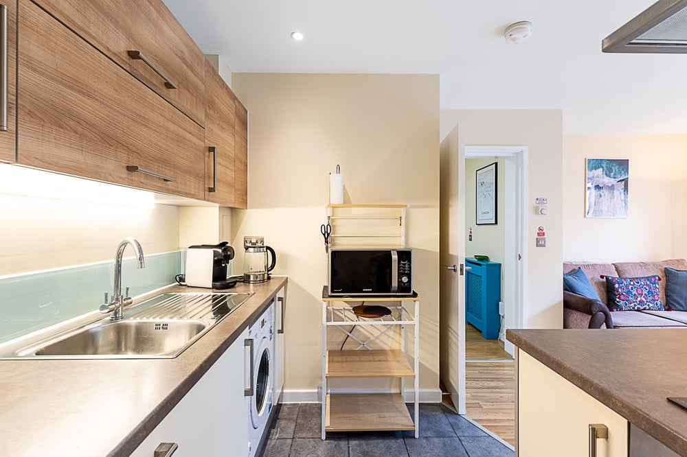 Welcome to this stylish and contemporary one bedroom apartment in the heart of Bow, offering a calm and comfortable base for exploring East London. Designed with relaxation in mind, this bright and modern retreat is ideal for couples, small families or business travellers seeking a well connected yet characterful neighbourhood stay. The flat accommodates up to three guests and features one spacious bedroom with a double bed, along with a double sofa bed in the living area. There is one bathroom with a shower over the bath. Situated on the first floor, the apartment also benefits from a private balcony and a dedicated dining bar area. Inside, the home opens into a light filled open plan living space where clean lines and warm wood accents create a welcoming, contemporary feel. The lounge is arranged for comfort, with large glass doors that allow natural light to pour in and lead directly onto the balcony, a perfect spot for a morning coffee or a relaxed evening drink. The kitchen is fully equipped with modern appliances, including a dishwasher, and sleek cabinetry that blends style with practicality. A breakfast and dining bar provides a sociable space for casual meals or catching up after a day out. The bedroom has been thoughtfully styled in soothing neutral tones with warm flooring and soft bedside lighting, creating a peaceful setting for a restful night’s sleep. The bathroom is finished with stone effect tiling, a full bath with overhead shower and a heated towel rail, giving it a fresh, spa like atmosphere.