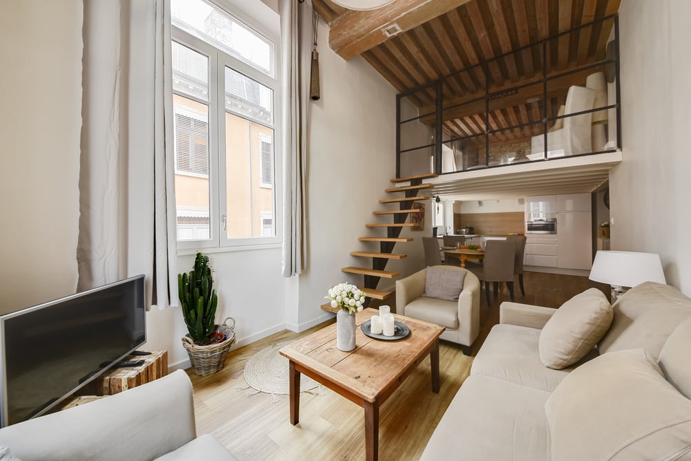 Welcome to our home! A recently renovated duplex with all the comforts and amenities you'll need for a magnificent stay in Lyon. Upstairs, in the room you will find a double bed fitted with hotel quality linens. This charming apartment can accommodate 4 people very comfortably. Be carefull, height of the mezzanine is 1m70 The kitchen is fully equipped. You will have all the necessary utensils to prepare and enjoy your meals at the table. The bathroom has a shower, a hairdryer and a large mirror. And we provide fresh towels and toiletries for your convenience. A reversible portable AC is available for your comfort. You can also relax in the living room, with television, wifi connection.