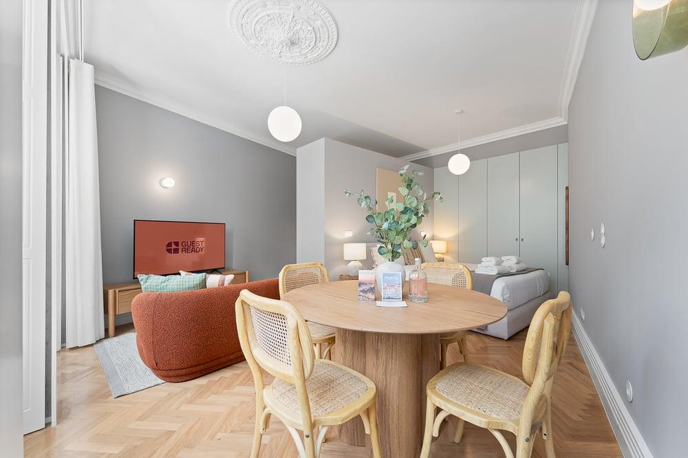 Welcome to my studio! This charming 52 m² retreat features beautiful decor and an unbeatable location, close to popular attractions, shops, supermarkets, and a wide variety of restaurants offering flavors from around the world. Its open-plan layout combines the living, dining, sleeping, and kitchen areas into one inviting space. You’ll enjoy a comfortable queen bed with hotel-quality linens, a sofa, a flat-screen TV for your favorite shows, and a dining table perfect for shared meals. It also has access to a balcony with street views. The kitchenette is fully equipped with essential cookware and utensils, including an electric hob, oven, and coffee machine, making it easy to prepare delicious meals. Large windows fill the studio with natural light, creating a bright and welcoming ambiance. The bathroom is stocked with towels and complimentary toiletries, and the entire space is professionally cleaned for your comfort. Located on second first floor with an elevator, this thoughtfully designed studio is ready to make your stay enjoyable. Enjoy your stay!