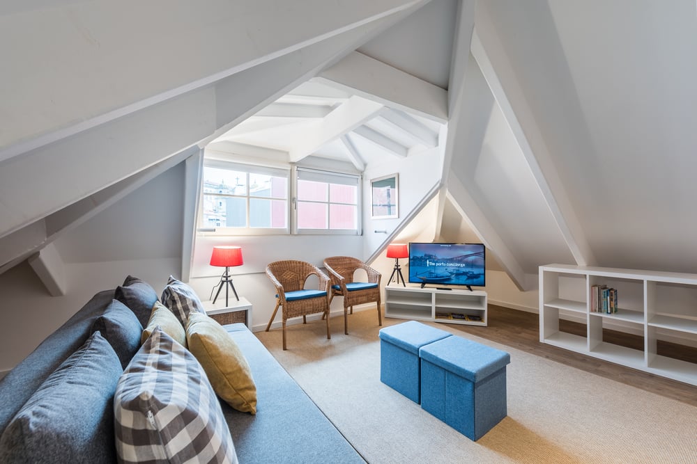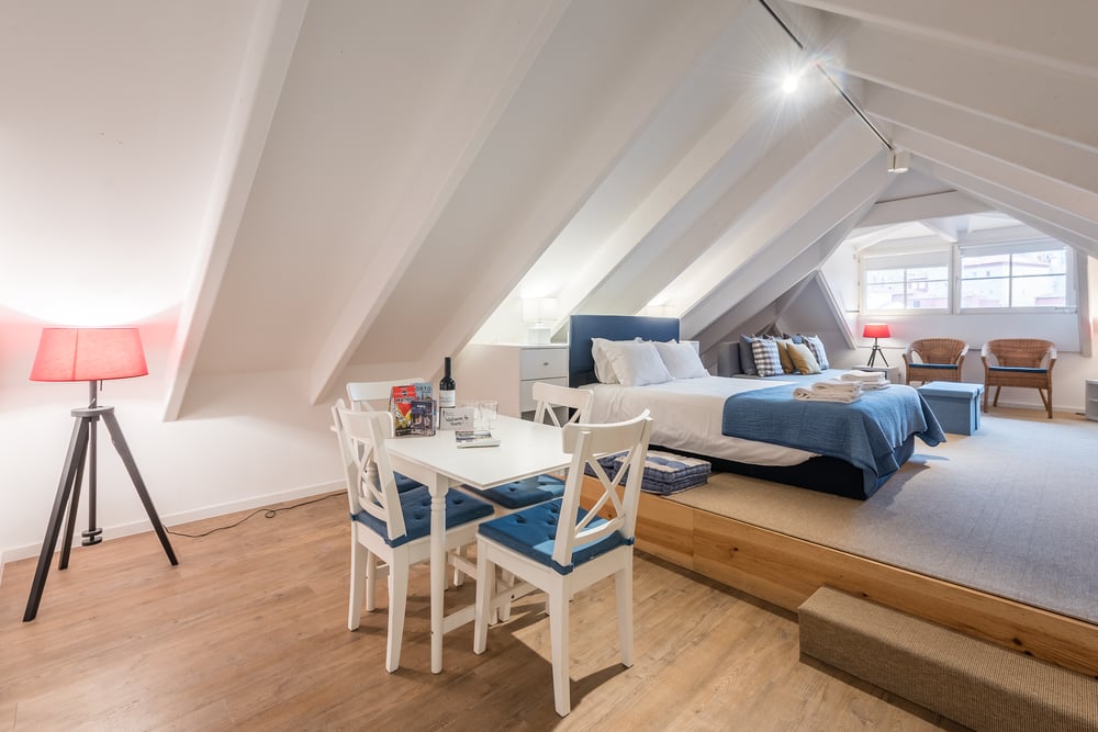 The six “São Domingos” apartments are located at the end of “Rua das Flores”, less than 150 meters from Ribeira, the typical and famous area by the River Douro. Each apartment is fully equipped, including air conditioning and windows with thermal and acoustic insulation. It is located in the 4th floor without an elevator. “The Cathedral” is one of these apartments, named after the Cathedral that can be seen from the attic window, over the roofs. The apartment has 40 square meters, is on the fourth floor of the building under the roof, and can accommodate up to four adults. In the area of this big open space, there is a double-bed, a sofa that can be turned into a comfortable bed for two extra people, a flat-screen TV, a fully equipped kitchenette, a table for meals as well as other amenities. There is a full bathroom. A baby cot can be provided upon request. This apartment can be joined with the “Attic” apartment, converting them into a spacious apartment, for up to 6 adults.