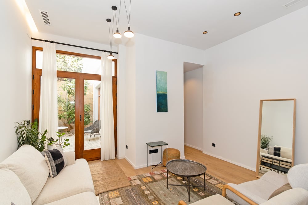 Welcome to my apartment! Modern and charming apartment located in the Cabanyal area of Valencia, one of the city’s most distinctive neighborhoods. It’s close to the beach and has very easy access to different areas depending on your needs. This ground-floor gem combines modern functionality with a unique design. Completely renovated and beautifully furnished, it features an open-plan kitchen connected to the living and dining area, fully equipped with everything you may need — induction cooktop, refrigerator, oven, coffee maker, as well as essential cutlery and utensils. The property also includes a washing machine, water heater, and ironing equipment should you need them during your stay. The dining area has space for four guests. From the kitchen, you’ll find the living room, furnished with a comfortable sofa and chairs for relaxation and socializing. The living room opens onto a terrace that also connects to the main bedroom. Down the hallway, you’ll find the main bedroom with a double bed, which has direct access to the interior terrace — a perfect spot to enjoy the Mediterranean weather. In addition, there is a second bedroom/office with a sofa bed (140 cm wide) and a SMART TV for those who enjoy watching news or specific programs. This room also includes a desk and office chair, making it ideal for working or studying comfortably from home. The property has a full bathroom and an additional toilet for the convenience of all tenants. Both bathrooms are stocked with complimentary toiletries and essentials for your first use. All beds come with bed linen ready for immediate use. The apartment is always professionally cleaned for your comfort. Note: This is a temporary rental apartment – not available for tourist stays. To complete the booking, it is essential to sign a temporary lease agreement and provide proof of the reason for your stay. Once your booking is confirmed, you will receive a contract to sign. Without the signed contract, the reservation will be canceled without refund. Enjoy your stay!