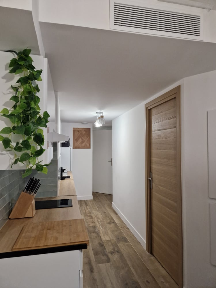 The flat is located on the first floor with a lift. It has a bathroom (shower, sink, toilet), a bedroom with a double bed, and a fully equipped kitchen (kettle, coffee maker, oven, toaster, extractor hood, dishwasher, microwave, induction hob, refrigerator) opening onto a living room with a sofa bed, table, chairs and TV.