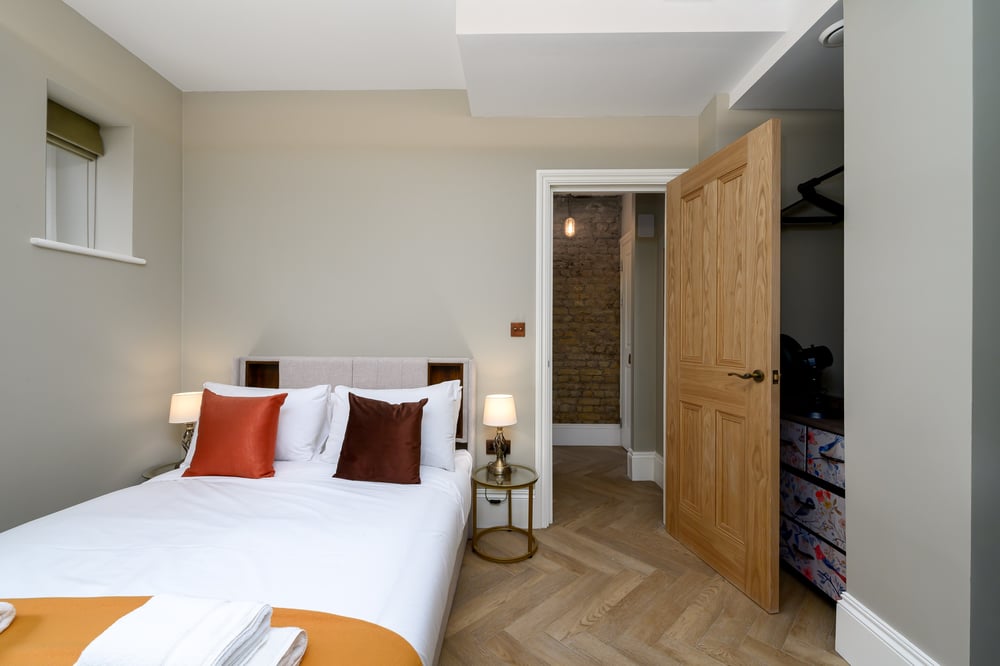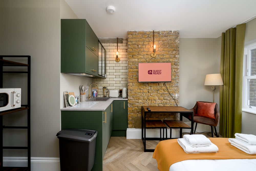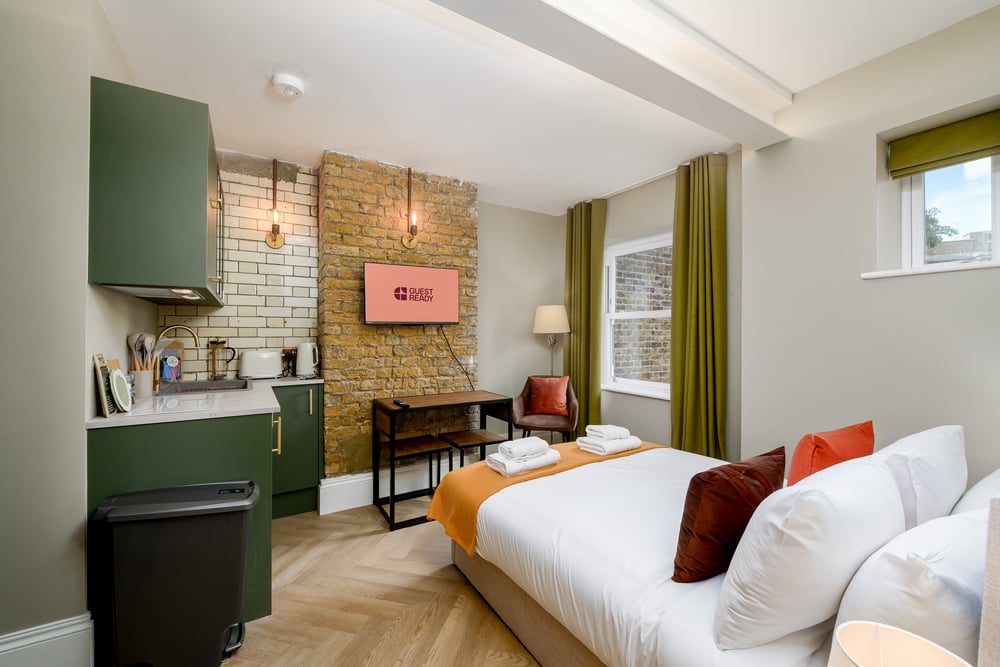 Welcome! Step into a warm and inviting studio where rustic charm meets modern convenience. Unique touches like exposed brick walls and brass fixtures add character, while soft lighting enhances the cosy atmosphere. The space features a comfortable double bed, armchairs and a smart TV, perfect for unwinding after a day of exploring London. Enjoy a meal prepared in the well-equipped kitchenette, complete with a hob, microwave, toaster, kettle and fridge. The bathroom offers a relaxing space to unwind, featuring a glass-partitioned shower set against rich blue tiles. You'll find everything you need to freshen up, including towels and complimentary toiletries for your convenience. The studio is always professionally cleaned for your comfort. Enjoy your stay!