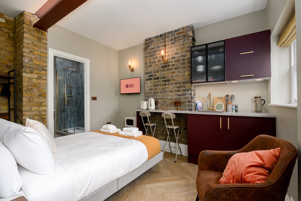 Welcome! Step into a warm and inviting studio where rustic charm meets modern convenience. Unique touches like exposed brick walls and brass fixtures add character, while soft lighting enhances the cosy atmosphere. The space features a comfortable double bed, armchairs and a smart TV, perfect for unwinding after a day of exploring London. Enjoy a meal prepared in the well-equipped kitchenette, complete with a hob, microwave, toaster, kettle and fridge. The bathroom offers a relaxing space to unwind, featuring a glass-partitioned shower set against rich blue tiles. You'll find everything you need to freshen up, including towels and complimentary toiletries for your convenience. The studio is always professionally cleaned for your comfort. Enjoy your stay!