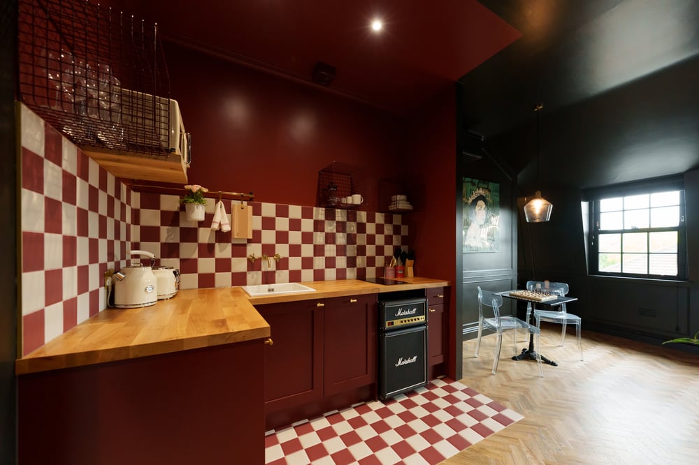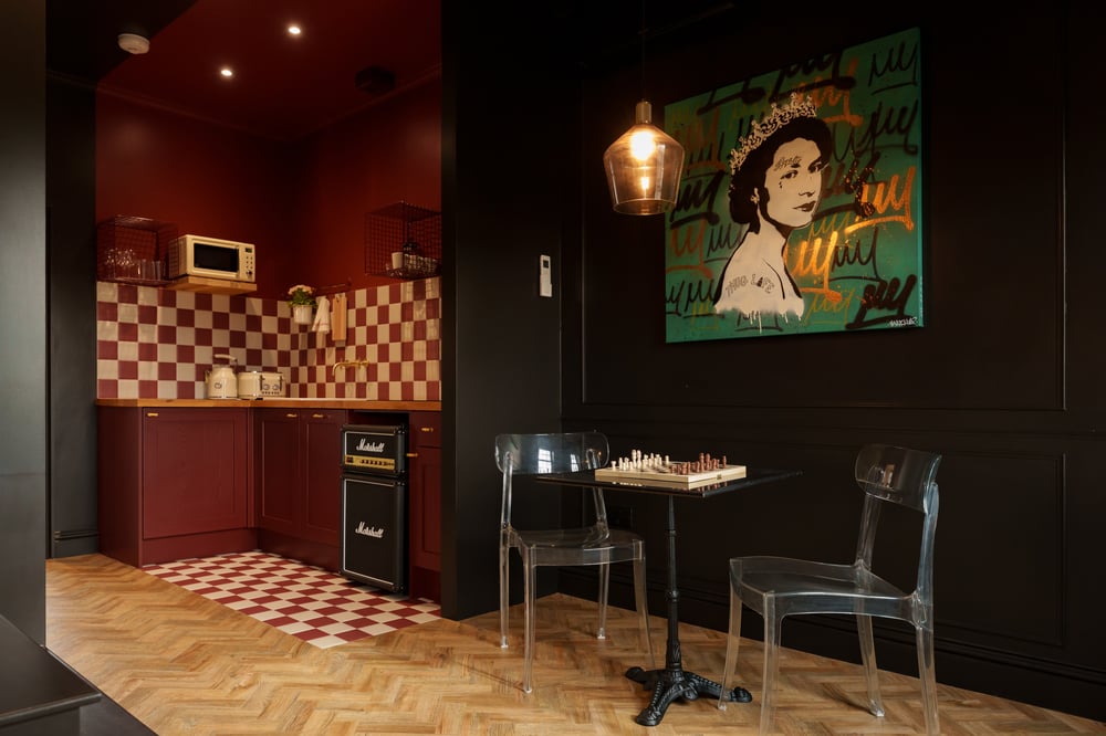 Welcome to The Camden Studios – your stylish, eco-friendly retreat in Central London! Dive into Camden's vibrant music scene, soak up the punk rock history, savor street food and explore nearby gems like Regent's Park, London Zoo, and Primrose Hill. Unwind in historic pubs, all just moments away. Our spacious, secure studios blend modern amenities with a unique character, offering the perfect base for your London adventure. This memorable studio is a cosy, artistic space designed to reflect Camden's rich punk rock and musical history. The décor is full of character, with elements that pay homage to the area's iconic music scene. It features a comfortable double bed with hotel-quality linens for a restful night's sleep and a flat-screen TV with Netflix for unwinding after a day of exploration. For a special touch, this studio offers a hidden shared terrace – perfect for outdoor dining or drinks on warm summer evenings. The kitchen, with its bold red and white checkered design and warm wooden countertops, is fully equipped with all the essentials – microwave, toaster, kettle, and stovetop – blending functionality and charm. Complimentary tea and instant coffee are provided for your convenience. The bathroom is stocked with fresh towels and toiletries to keep you refreshed throughout your stay. Rest assured, the studio is professionally cleaned for your comfort, allowing you to truly relax. Please note that there is ongoing construction near the building. The works are expected to continue for approximately 2 to 3 weeks. During this period, there may be some noise or minor disturbances. We appreciate your understanding and apologise for any inconvenience this may cause. Enjoy your stay!