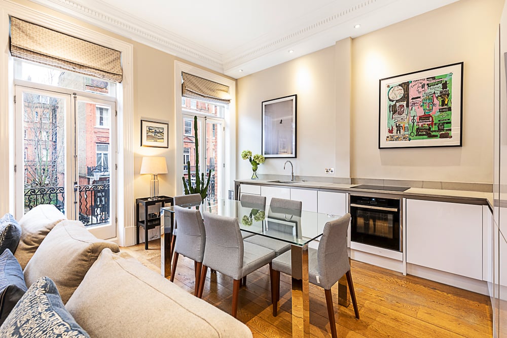 This exquisite first-floor apartment offers a luxurious retreat in the heart of Kensington, perfect for couples or solo travellers seeking a stylish and comfortable base in London. The flat combines modern sophistication with timeless elegance, offering a tranquil setting while being steps away from vibrant neighbourhood attractions. With its thoughtful design and prime location, this property is ideal for a memorable city stay. The apartment features a spacious bedroom with a super king-sized bed, enveloped in soft, muted tones for a serene ambiance. Floor-to-ceiling wooden wardrobes provide ample storage, and large sash windows invite natural light to flood the space, creating a bright and inviting atmosphere. The bathroom is a contemporary haven, boasting sleek marble finishes, a frameless walk-in shower with a rainfall shower head, and a custom wooden vanity that adds both practicality and luxury. Additionally, the separate WC adds extra convenience. The private balcony offers a charming spot to relax and enjoy the city vibe. The open-plan living, dining, and kitchen area is a perfect blend of comfort and modernity. Plush seating, chic artwork, and modern shelving define the living space, while the dining area features a glass-top table with upholstered chairs for elegant meals. The kitchen is equipped with high-gloss cabinetry, integrated appliances, and a streamlined design that makes cooking a pleasure.