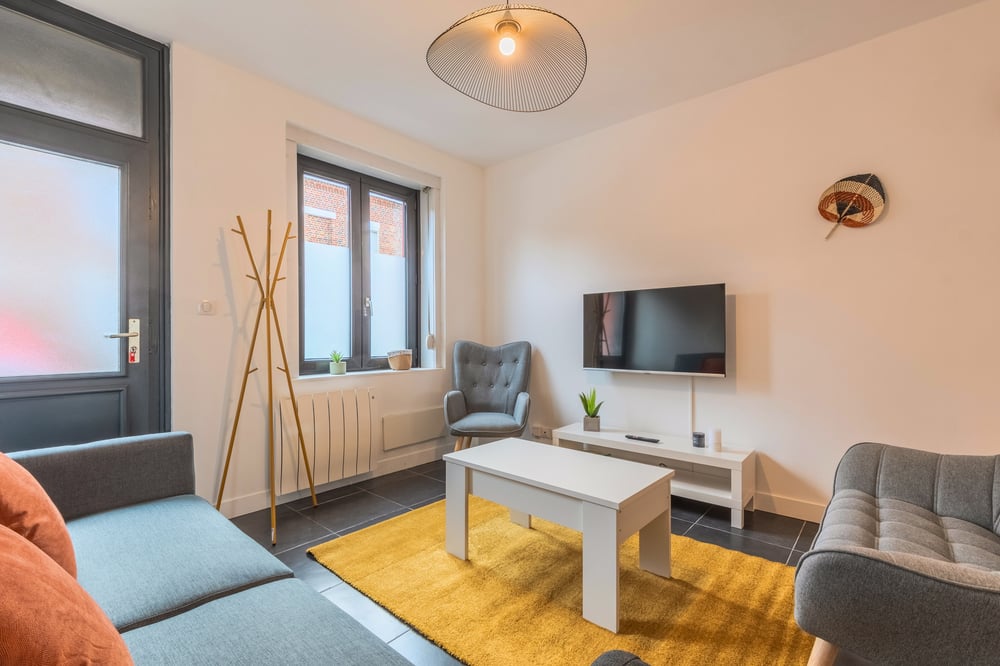 The house is composed as follows: Ground floor - Entrance opening directly onto the living room area (internet and connected TV available) - Dining area - Equipped kitchen - Small laundry area with a washing machine - separate WC - Terrace at the back with a plancha for sunny days First floor : - Bedroom with double bed on the street side - Bathroom with shower, bathtub and sink, courtyard side Second floor : - Bedroom with double bed on the street side - Attic room with double bed on the courtyard side (rather suitable for children) Please note that the stairs in the accommodation are typical of our pretty buildings in Lille: the stairs are narrow, so we recommend that families with young children or people with mobility difficulties take this into consideration before booking. The accommodation will be carefully prepared for your arrival: Professional cleaning service + laundry for linens. All linen is provided: bed linen, bath towels, bath mats and tea towels. The kitchen is equipped with all the utensils and dishes for lunch and dinner. Here is the entertainment available to you via TV: Molotov TV and Prime Video.