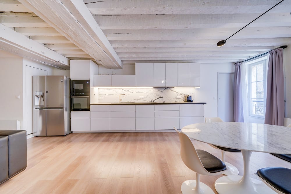 - 1 large living room with stone walls and exposed beams - 1 modern, open-plan kitchen - 2 bedrooms with storage space - 1 bathroom with shower and bathtub - 1 toilet THE KITCHEN The kitchen includes a hob, dishwasher, fridge, freezer, microwave, oven, toaster, kettle and Nespresso coffee machine. EQUIPMENT All amenities provided: wifi, hairdryer, coffee pods, sponges, bin bags, washing machine, tumble dryer, hotel-quality bed linen and towels, professional cleaning before and after each booking.