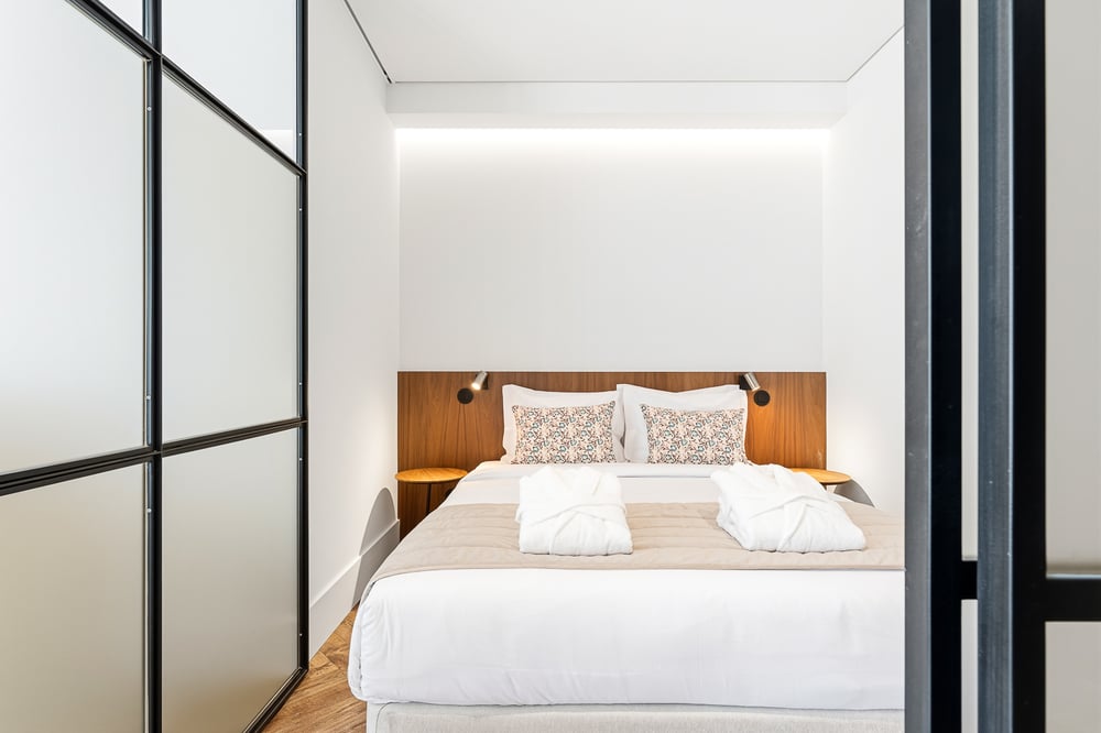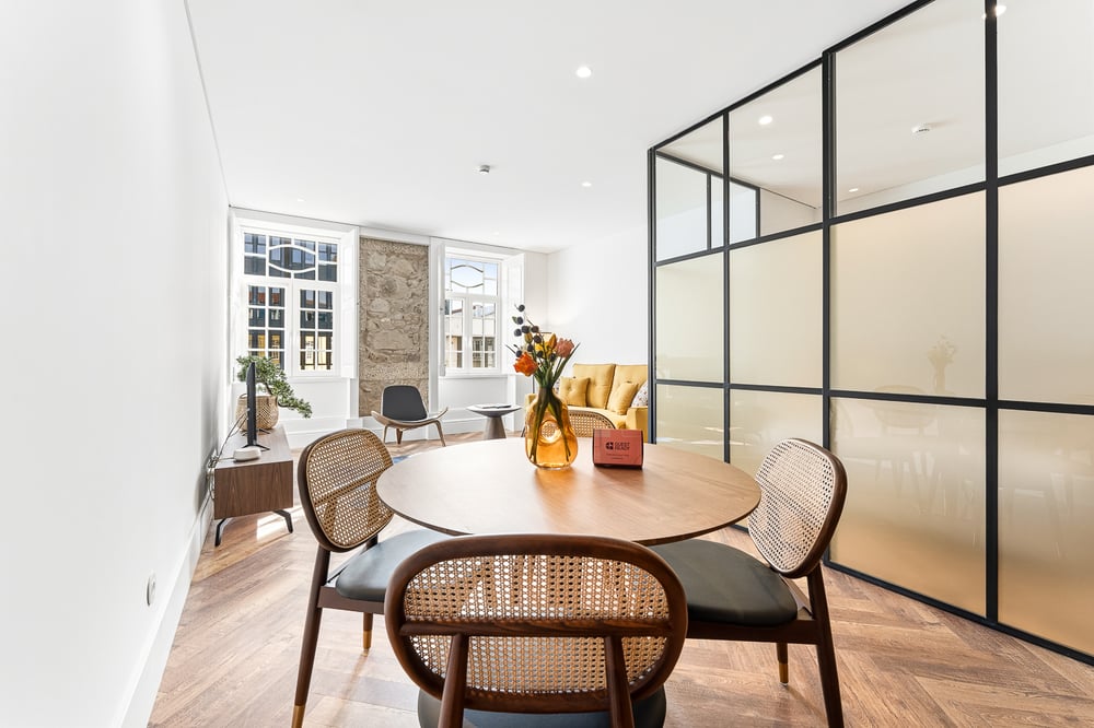 Welcome! This bright studio, decorated in detail to provide exceptional comfort and make you feel at home, is the perfect starting point to explore the city of Braga and its attractions. This studio features an open-plan living room and kitchen. The living room, which preserves one of the original stone walls, is equipped with a comfortable sofa, an elegant dining table, and a TV — the perfect space to relax. The kitchen is fully equipped and ideal for preparing all your daily meals. In addition to crockery and basic utensils, the kitchen has a kettle, toaster, coffee machine, oven, hob, dishwasher, and fridge to help you throughout your stay. As a highlight, the building offers access to a luxurious shared indoor pool. This space is a true wellness retreat where you can take a relaxing dip and unwind at any time. The bedroom, separated from the living area by an elegant glass and metal partition, is harmoniously decorated and equipped with a spacious double bed dressed with quality bed linen to ensure maximum comfort. The bathroom has all the amenities, including towels and toiletries for your convenience. The space is always professionally cleaned. Please note that the building is located on one of the main avenues of the city, where traffic is exclusively pedestrian. Enjoy your stay!