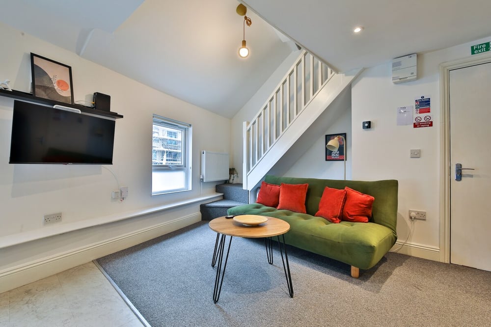 As you step inside, you'll be greeted by an open and airy living area, tastefully decorated with an industrial-inspired aesthetic. The natural light floods through the large windows, creating a warm and inviting atmosphere. Kick back and relax on the plush sofa or catch up on your favourite shows on the flat-screen TV. The mezzanine level offers a unique and cozy sleeping area, elevated above the living space. Climb up the stairs to find a comfortable queen-sized bed adorned with soft linens and pillows, ensuring a restful night's sleep. Wake up to beautiful views through the skylight, providing a glimpse of the morning sky. The fully equipped kitchen is a culinary haven, featuring modern appliances and ample countertop space. Whip up a delicious meal or brew a fresh cup of coffee with the Nespresso Coffee Machine to start your day off right. The dining area adjacent to the kitchen provides the perfect spot to enjoy your meals or plan your itinerary for exploring Cardiff. The bathroom boasts contemporary fixtures and a rejuvenating shower, complete with complimentary toiletries and fluffy towels for your convenience. Whether you're preparing for a day of business meetings or getting ready for a night out on the town, the bathroom offers a tranquil space to freshen up. During your stay, stay connected with high-speed Wi-Fi available throughout the flat. Additionally, the flat provides ample storage space for your belongings, ensuring a clutter-free environment throughout your stay.