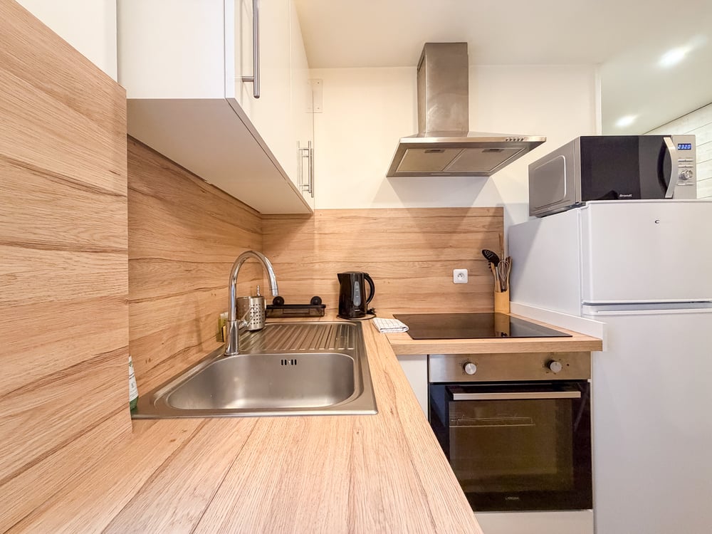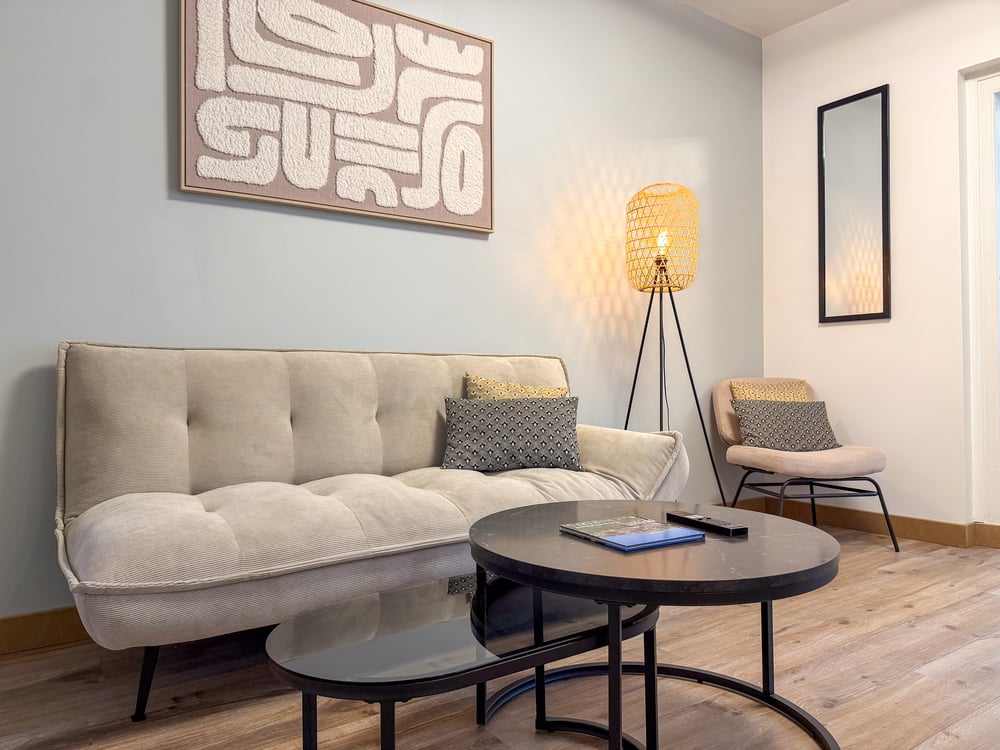 The flat offers 51 m² of living space and is located on the ground floor of a small two-storey building in the heart of the city. The two bedrooms tastefully combine old-world charm with contemporary comfort. Period parquet flooring, a decorative fireplace and queen-size beds create the perfect cocoon in which to relax after a day of exploring. The bathroom is equipped with a shower, towel dryer, washing machine and hairdryer for optimal comfort (toilet in the bathroom). The open-plan kitchen is fully equipped, allowing you to prepare your meals just like at home.