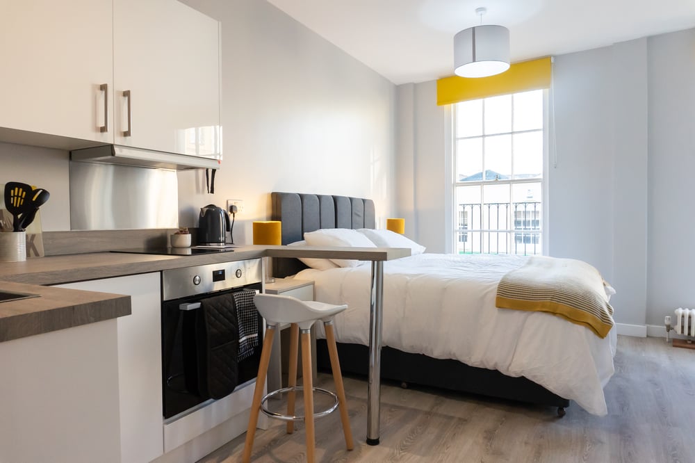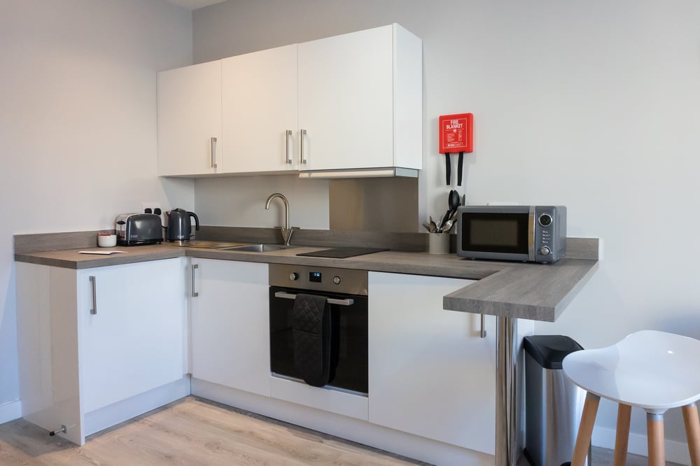 Step into our inviting studio where comfort meets convenience. The open-plan design features a plush super king bed adorned with elegant artwork above, ensuring a restful night's sleep. Enjoy your favorite shows on the wall-mounted TV or catch up on emails at the small desk. The compact kitchen, equipped with a sink, electric stove, microwave, and kettle, is perfect for whipping up quick meals. Refresh in the modern bathroom, complete with a sleek shower and contemporary finishes.