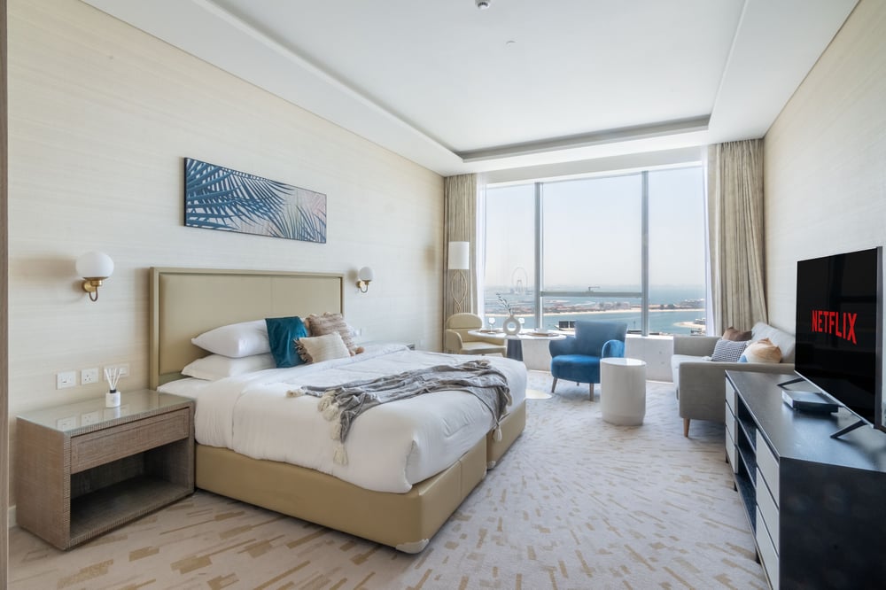 Welcome to my home! Wake up to marvellous views of the world-famous Palm Jumeirah and the azure waters of the Persian Gulf right by your window. This studio unit offers first-class amenities with direct access to the Nakheel Mall from the building. Designed with an open floor plan complete with high-end room amenities, this home is a peaceful place to retreat after a long day enjoying Palm Jumeirah and nearby areas. The luxurious king bed comes with complimentary hotel-quality linens to ensure a good night's rest and a sizeable wide-screen TV with built-in streaming services. The open-plan kitchen has all the essential cookware and cutleries to fulfil culinary requirements. The dining area by the window has a beautiful dining table and comfortable seating to relish your meals in luxury and style. The bathroom has all the amenities you need to freshen up, including clean towels and complimentary toiletries. The apartment is always professionally cleaned for your comfort. Daily housekeeping services are available upon request for an additional fee. Enjoy your stay! Please note, Dubai is a vibrant and ever-growing city, and with these developments come occasional construction in the apartment building or surrounding area. While this may bring some urban sounds or affect the views from the property, it is all part of the city’s dynamic growth. We truly appreciate your understanding and look forward to hosting you.