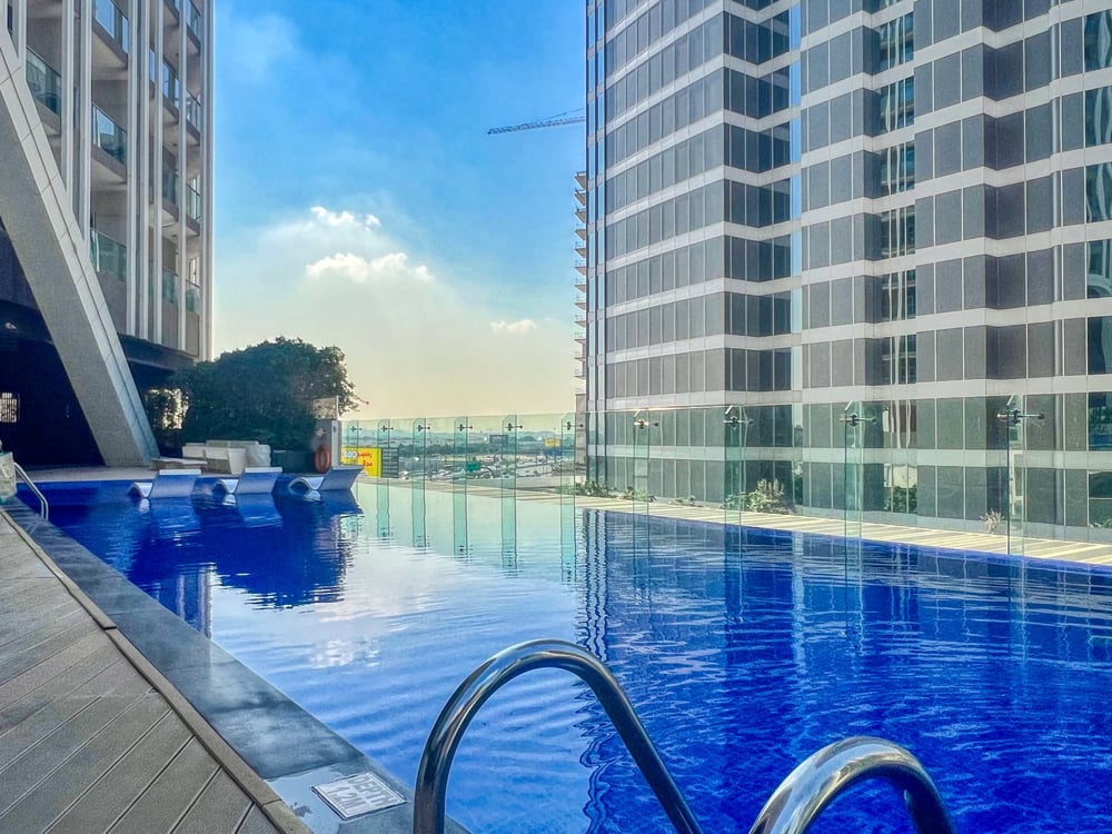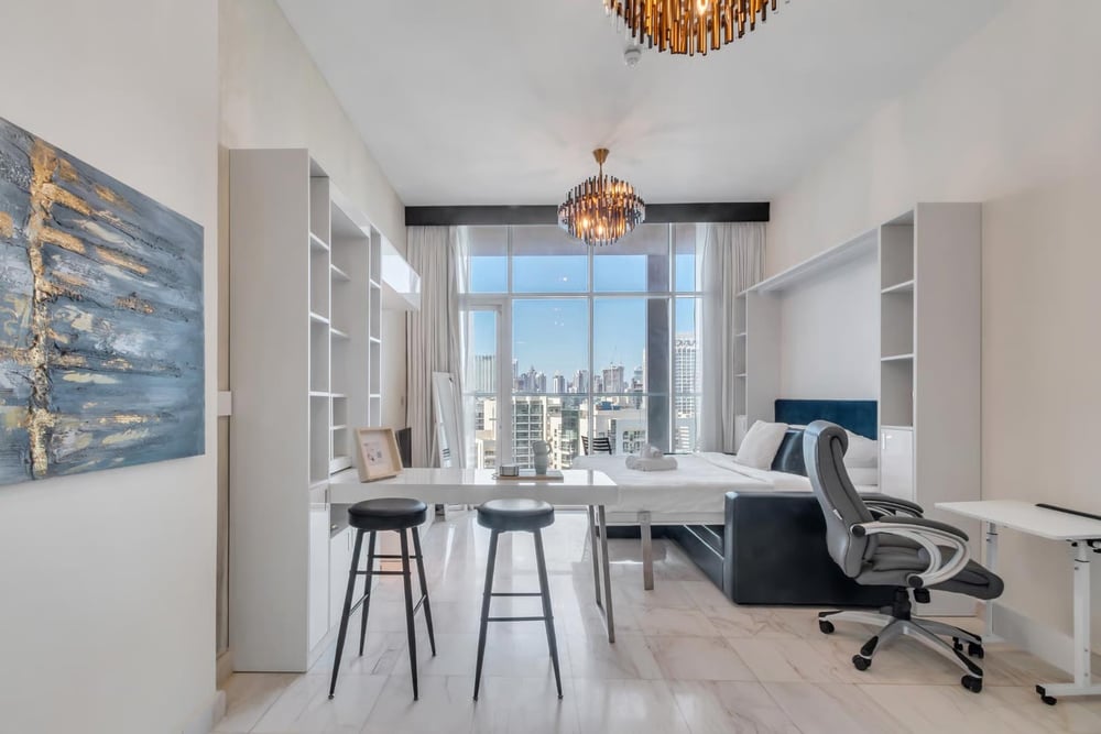 Welcome to my studio! This studio is located on the 22nd floor and accessible by lift. Designed with an open-plan floor plan complete with high-end room amenities, this studio is a peaceful place to retreat after a long day in the city. The sleeping area contains a luxurious queen sized Murphy bed with complimentary hotel-quality linens to ensure a good night's rest. This space also boasts a laptop friendly working desk arrangement for your remote working needs. The area includes floor-to-ceiling windows that lead onto a furnished balcony where you can fully relax and enjoy a glimpse of Burj Khalifa. The open-plan kitchen includes top-of-the-range appliances, essential cookware, and cutleries to fulfil any culinary requirement. There is also a washer available for your laundry needs. The dining area has a beautiful table with high stools to relish your meals in luxury and style. The bathroom has all the amenities you'll need to freshen up, such as a rain shower, a toilet and a sink. Clean towels and complimentary toiletries will also be supplied for your convenience. The studio is always professionally cleaned for your comfort. Daily housekeeping services are available upon request for an additional fee. Enjoy your stay! Note: The swimming pool is not accessible due to maintenance issues until further notice. Please note, Dubai is a vibrant and ever-growing city, and with these developments come occasional construction in the apartment building or surrounding area. While this may bring some urban sounds or affect the views from the property, it is all part of the city’s dynamic growth. We truly appreciate your understanding and look forward to hosting you. Enjoy your stay!