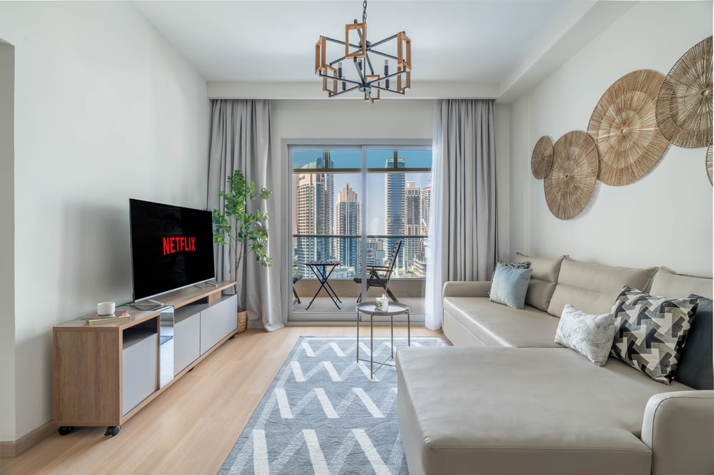 Welcome to my apartment! Perched on the 15th floor, this modern and tastefully decorated 90m² apartment offers a prime location close to top Dubai attractions, including Dubai Marina Mall and the Dubai Marina Yacht Club. Designed with an open floor plan, the spacious living room features a comfortable double sofa bed, a wide-screen smart TV with multiple streaming options for your favourite shows, and a dining area. Step out onto the private balcony, furnished with seating, and enjoy the stunning high-rise views of the Marina. The kitchen is fully equipped with everything you need to prepare meals, including a stove, oven, microwave, and essential cookware and cutlery. For your convenience, there's also a dishwasher to make post-meal cleanup effortless, along with a washer, dryer, drying rack, and ironing equipment to take care of your laundry needs. The apartment features two well-appointed bedrooms—one with a luxurious king-sized bed and the other with a queen-sized bed. Both rooms are outfitted with complimentary hotel-quality linens to ensure a restful night’s sleep. The two modern bathrooms are stocked with fresh towels and complimentary toiletries, providing all the essentials for a comfortable stay. During your stay, you’ll have full access to the building’s pool and gym, offering relaxation and fitness opportunities without leaving the residence. Please note that the building lobby is undergoing major renovations until the end of November. Rest assured, there will be no noise inside the apartment during working hours. Please note, Dubai is a vibrant and ever-growing city, and with these developments come occasional construction in the apartment building or surrounding area. While this may bring some urban sounds or affect the views from the property, it is all part of the city’s dynamic growth. We truly appreciate your understanding and look forward to hosting you. Daily housekeeping services are available upon request for an additional fee. The apartment is always professionally cleaned to ensure a comfortable and welcoming environment. Enjoy your stay! GuestReady is not the owner of this property and acts solely as an agent managing the property on behalf of the owner.