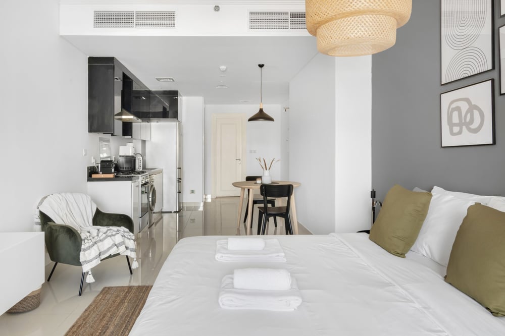 Welcome to my home! This studio apartment in Damac Capital Bay, Dubai is perfect for couples, business travelers, or even solo travelers. The apartment features a fully equipped kitchen complete with all the necessary amenities, a living area with contemporary furnishings, a washer, a swimming pool, and a gym. As followed, you find: - A living area with a flat-screen TV, and a coffee table. There is also a dining table for 2 at your disposal. - King size bed in the bedroom - A fully-equipped kitchen with a stove, fridge, oven, microwave, electric kettle, toaster, and coffee maker. A washer is at your disposal. - A bathroom with a walk-in shower, a bath, mirror, and toilet with bidet. - Access to shared facilities in the building: The swimming pool, and gym. Fresh towels and bedsheets are provided, along with complimentary toiletries, cleaning, and sanitization before your arrival. Daily housekeeping services are available upon request for an additional fee. Enjoy your stay! Please note, Dubai is a vibrant and ever-growing city, and with these developments come occasional construction in the apartment building or surrounding area. While this may bring some urban sounds or affect the views from the property, it is all part of the city’s dynamic growth. We truly appreciate your understanding and look forward to hosting you.