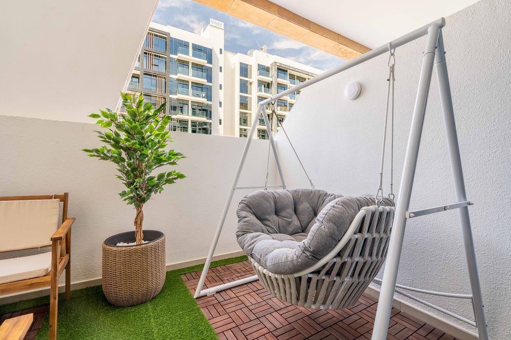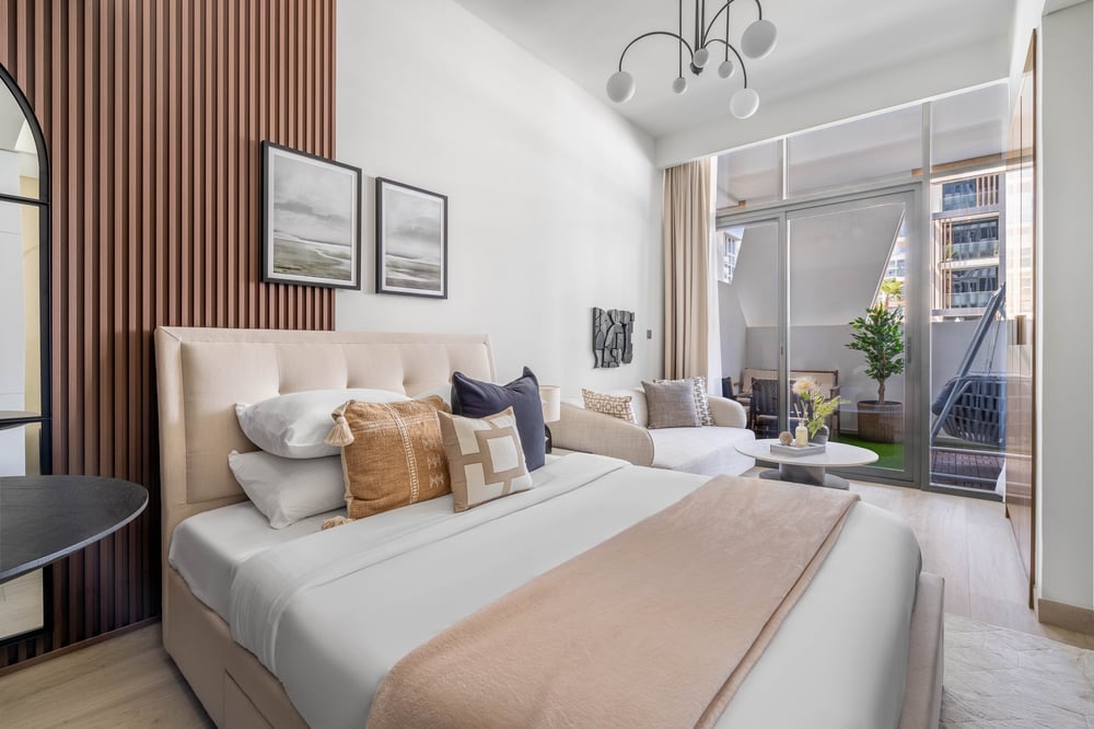 Welcome to my studio! Experience a tranquil and luxurious vacation in this charming dwelling that exudes elegance and sophistication in every corner. Its sleek design and refined interiors embody the essence of simple yet refined beauty, perfect for couples, friends, or business travelers! Located on the 1st floor, this newly handed-over studio apartment combines French Mediterranean aesthetics with modern architectural elements and is fully furnished with brand-new appliances. The contemporary living space perfectly balances modernity and minimalism, offering a cozy atmosphere. A beautiful sofa will be adorned with plush cushions to ensure your utmost comfort. Just across the room, you'll find a Smart TV, high-speed internet, and a versatile workspace that can quickly transform into a dining area for two, catering to your space-saving needs. Indulge in a restful slumber on the spacious king-sized bed with a comfortable mattress, premium linen, and soft pillows. With floor-to-ceiling windows illuminating the space, transforming it from ordinary to extraordinary. Step out onto your spacious private balcony, furnished with outdoor seating, and bask in the refreshing breeze while enjoying your time here. The kitchen is fully equipped, including top-of-the-range appliances, essential cookware, and cutleries, allowing you to prepare delicious meals conveniently. The apartment also has a washer and ironing equipment for your laundry needs and a dishwasher for convenience. Equipped with one bathroom, it contains all the necessary amenities, including clean towels and complimentary toiletries. Rest assured, the studio is always professionally cleaned for your comfort. Daily housekeeping services are available upon request for an additional fee. Enjoy your stay! Please note, Dubai is a vibrant and ever-growing city, and with these developments come occasional construction in the apartment building or surrounding area. While this may bring some urban sounds or affect the views from the property, it is all part of the city’s dynamic growth. We truly appreciate your understanding and look forward to hosting you.