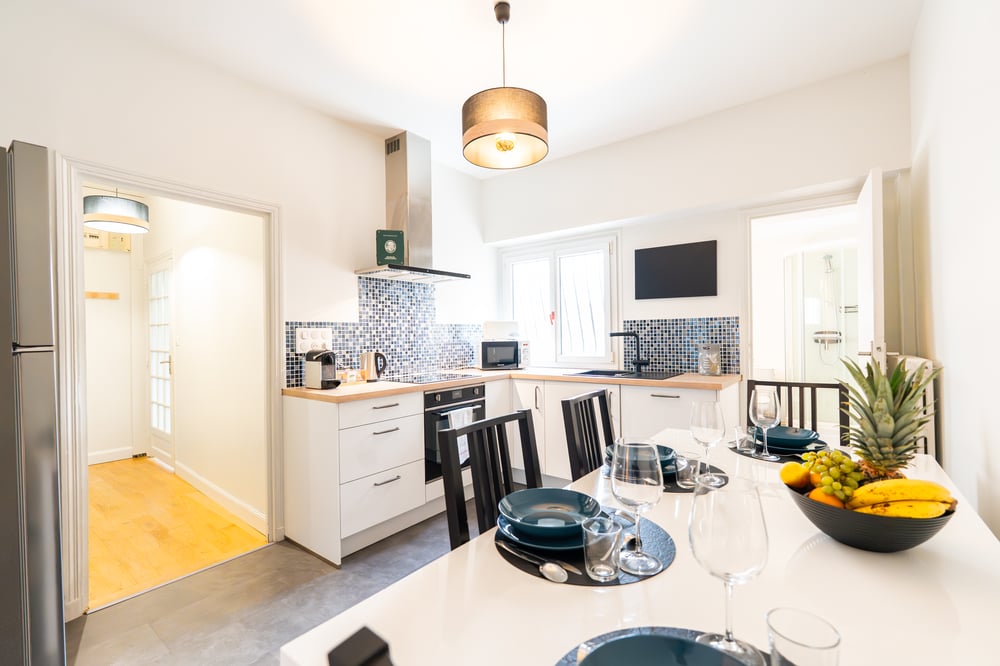 ------------------------------------------- LES POINTS FORTS ------------------------------------------- → PROFESSIONAL LINEN AND CLEANING SERVICE → HIGH-SPEED WIFI → CITY CENTER LOCATION ------------------------------------------- Précisions ------------------------------------------- → The apartment is located on the 1ST FLOOR of a 2-STORY BUILDING. → It is a ONE-BEDROOM APARTMENT (T2) including: 1 BEDROOM with a QUEEN-SIZE BED (160 CM) 1 LIVING ROOM with a SOFA BED 1 MODERN SHOWER ROOM 1 FULLY EQUIPPED KITCHEN open to the living area → SELF CHECK-IN via KEY BOX or SMART LOCK. ------------------------------------------- 100 % PRATIQUE ------------------------------------------- → 1 QUEEN-SIZE BED (160 CM) + 1 SOFA BED for optimal comfort → HIGH-SPEED WIFI to stay easily connected → HD TV for relaxing evenings → FULLY EQUIPPED KITCHEN: OVEN, MICROWAVE, TOASTER, KETTLE, COFFEE MACHINE → WASHING MACHINE LOCATED ON THE GROUND FLOOR (shared access with other apartments) → EVERYTHING YOU NEED to cook and feel AT HOME ------------------------------------------- 100 % CLEAN ------------------------------------------- → BED LINEN collected, washed, and ironed by a PROFESSIONAL LAUNDRY SERVICE → BATH TOWELS collected, washed, and ironed by a PROFESSIONAL LAUNDRY SERVICE → CLEANING carried out by PROFESSIONAL STAFF