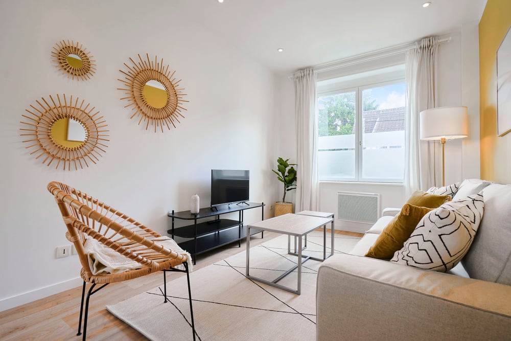 The apartment is laid out as follows: - Entrance leading to the kitchen area with American bar - Lounge area with TV - A bedroom area with a double bed - Bathroom with sink and walk-in shower - WC Professional maid service + laundry for linens. All linen is provided: bed linen, bath towels, bath mats and tea towels. The kitchen is equipped with all utensils and dishes for lunch and dinner. Here are the entertainment available to you via TV: Molotov TV, Prime Video!