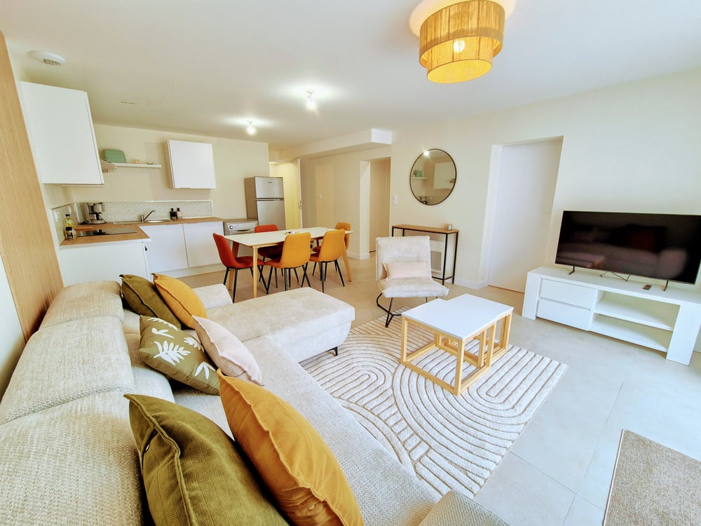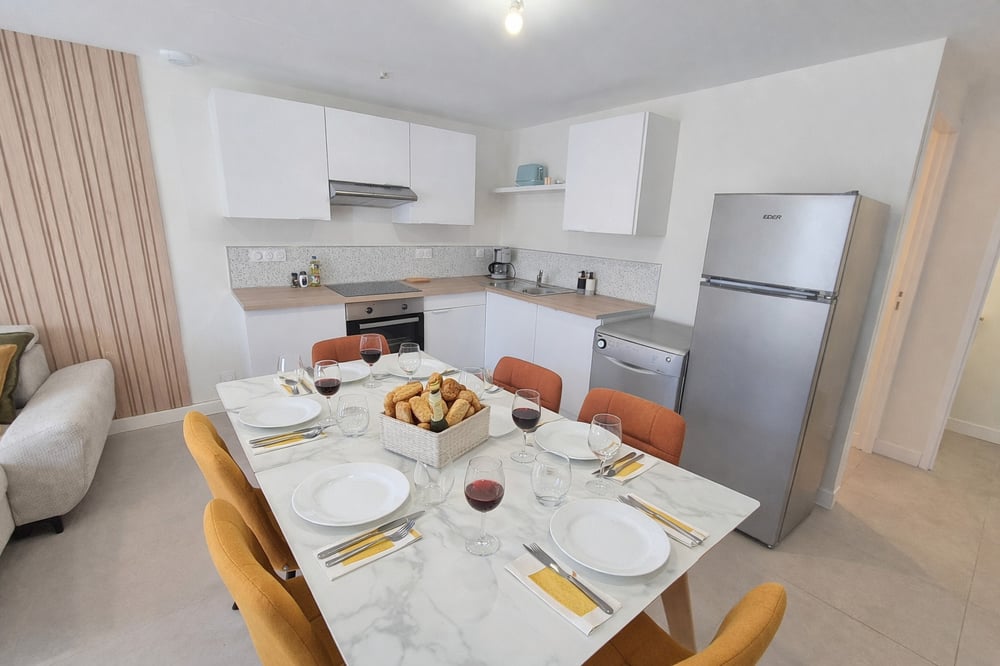 -> Accommodation located in the town of Les Herbiers. -> Capacity to host up to 6 guests. It consists of: *** Inside *** -> A dining area with a fully fitted and equipped kitchen (hob, extractor hood, oven, microwave, fridge, toaster, filter coffee maker, dishwasher, kettle…). Everything you need for cooking is provided. A welcome kit is offered including tea, coffee, sugar, and biscuits. -> A living room with a sofa bed (bed linen available in the bedroom wardrobe), a coffee table and a TV! -> Internet and Wi-Fi available! -> A bathroom with a shower, a mirror and a hairdryer. A bathroom kit is provided including soap, shower gel and shampoo. -> A separate toilet. -> Two bedrooms, each equipped with a 160×200 cm bed. Both also feature a wardrobe with hangers. *** Outside *** -> A private terrace with no overlooking neighbours, furnished with outdoor furniture. *** ALL bed linen and bath towels are included in the price – no extra charges! *** -> Free parking spaces available in the driveway and on the street. *** A key box is available, allowing you to check in independently. *** -> Check-in from 5 pm, check-out by 10 am at the latest. -> Pets are not allowed. -> A security deposit will be requested a few days before your arrival, depending on the booking platform. This mandatory step ensures the smooth running of your stay.