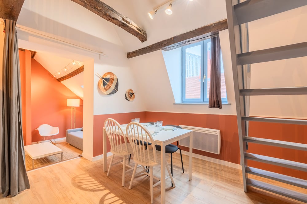 The apartment is located on the third and top floor of an old building in Lille. Please note that the stairs leading to and within the apartment are typical of our pretty Lille buildings: the stairs are narrow, so we recommend that families with young children or people with mobility difficulties take this into consideration before booking. The apartment comprises a hallway leading to a bathroom with bath and WC, a dining room for four with open-plan kitchen. A living room with sofa and TV, and a bedroom with double bed (140x200) and storage space. Finally, a staircase leads from the dining room to a large mezzanine under the roof with double bed (140X200). Professional cleaning service + laundry service for household linen. All linen is provided: bed linen, bath towels, bath mats and tea towels. The kitchen is equipped with all utensils and dishes for lunch and dinner. Entertainment available via TV: Molotov TV, Prime Video!
