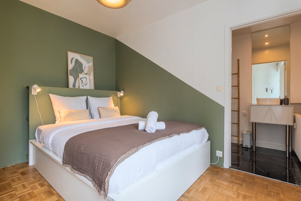 The flat comprises - Large living room with open-plan fitted kitchen, dining area and sitting area (with internet and connected TV) - One bedroom, courtyard side (therefore quiet) and equipped with a double bed - Bathroom with spacious shower and washbasin - separate WC The accommodation will be carefully prepared for your arrival: Professional cleaning service + laundry service for household linen. All linen is provided: bed linen, bath towels, bath mats and tea towels. The kitchen is equipped with all utensils and dishes for lunch and dinner. Entertainment available via TV: Molotov TV and Prime Video.