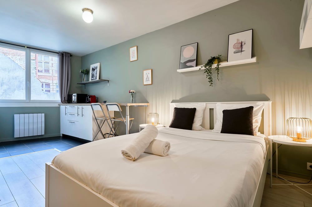 Fully-equipped studio ideally located in the center, perfect for discovering Lille on foot! In a charming street in Vieux Lille, rue Lepelletier, opposite Meert and near the Grand Place, 8 minutes on foot from train stations, 2 minutes from the metro!