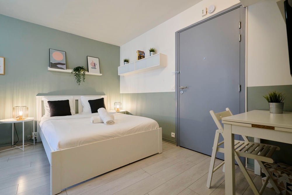 The apartment comprises a living room with double bed 140X200, a small office with TV. A dining area with high chairs opening onto a fully equipped kitchen with washing machine. A bathroom with bathtub and separate toilet. The apartment has been carefully prepared to welcome you: Professional cleaning service + laundry service for household linen. All linen is provided: bed sheets, bath towels, bath mats and tea towels. The kitchen is equipped with all utensils and crockery for lunch and dinner. Entertainment available via TV: Molotov TV and Prime Video! You'll love the apartment's location, with its many restaurants and stores!