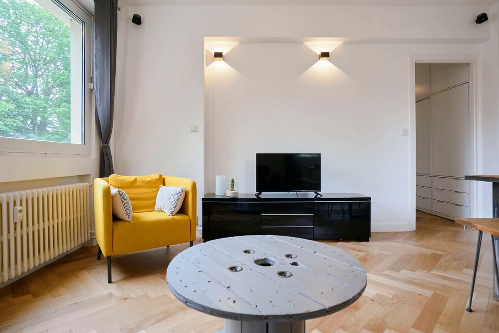 The flat comprises : - a living room - a spacious bedroom with dressing room - bathroom with bath - a fully equipped kitchen (oven, dishwasher, washing machine and microwave) - a storeroom in the kitchen with cleaning materials and a rubbish chute Professional cleaning service + laundry service for household linen. All linen is provided: bed linen, bath towels, bath mats and tea towels. The kitchen is equipped with all utensils and dishes for lunch and dinner. Entertainment available via TV: Molotov TV, Prime Video!