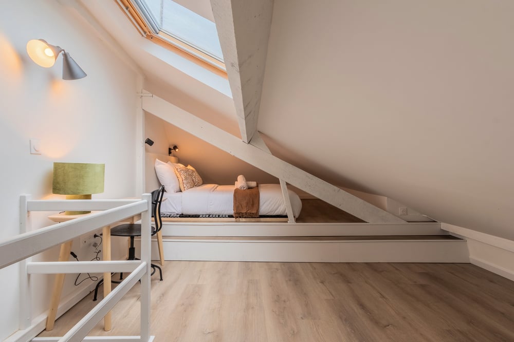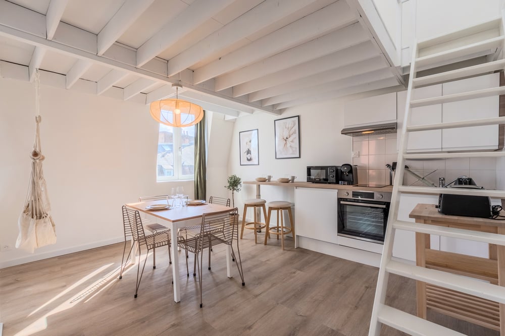 The apartment is composed as follows: - Entrance opening onto a large living room with lounge area, dining area and equipped kitchen - Bathroom with bathtub, sink and WC - Upstairs (steep stairs, be careful!) there is a bedroom with a double bed Air conditionning is available The building is not equipped with shutters, so the light cannot be completely blocked out. The accommodation will be carefully prepared for your arrival: Professional cleaning service + laundry for linens. All linen is provided: bed linen, bath towels, bath mats and tea towels. The kitchen is equipped with all the utensils and dishes for lunch and dinner. Here is the entertainment available to you via TV: Molotov TV and Prime Video.