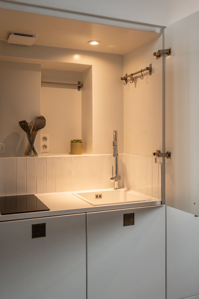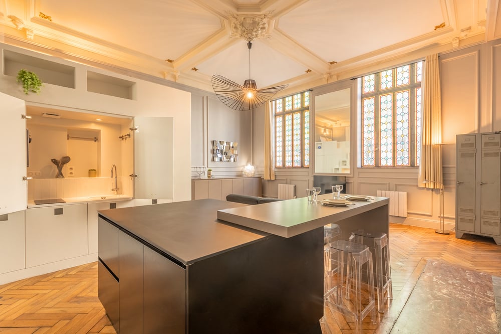 Please note: Please read the accommodation description carefully before confirming your reservation to avoid any unpleasant surprises upon arrival! The staircase leading to the bed is unusual and narrow, so we recommend that families with young children or people with mobility difficulties take this into consideration before booking. The apartment is located on the ground floor of an old building in Lille. It features stained-glass windows, high ceilings with moldings, herringbone parquet flooring... a decor that blends character and modernity! It consists of an open space including a living room, dining room, kitchen, and a double bed (140 x 190 cm) on the mezzanine, as well as a shower room. The bed was custom-made by a designer; it is very unusual and is accessed via stairs. It is located a stone's throw from the center of Lille, behind the Palais des Beaux-Arts! Ideal for a short stay while visiting Lille. For light sleepers, we recommend bringing your earplugs! The apartment will be carefully prepared for your arrival: Professional housekeeping service + laundry service for household linens. All linens are provided: bed linen, bath towels, bath mats, and tea towels. The kitchen is equipped with all utensils and dishes for lunch and dinner. Here's what entertainment is available via TV: Molotov TV, Prime Video!