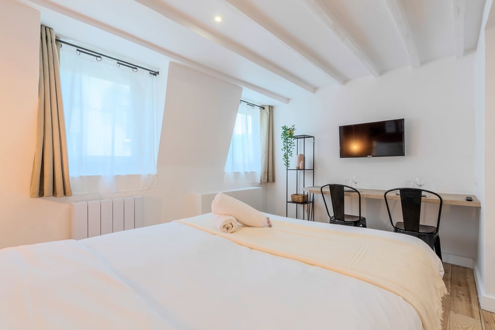 All on foot, the apartment is located on Rue Baptiste Monnoyer on the fourth floor of a typical Lille building, For information, renovation work is currently taking place in the building's common areas. This may cause some noise pollution, only during the day and excluding weekends. Please note that the staircase to access the apartment is typical of our pretty Lille buildings: the staircases are narrow, so we recommend that families with young children or people with mobility difficulties take this into consideration before booking (also think about luggage). The apartment consists of a living room with kitchen area, a double bed (140X200), modern decoration and a bathroom with shower. The apartment will be carefully prepared for your arrival: Professional cleaning service + laundry service for household linen. All linen is provided: bed linen, bath towels, bath mats and tea towels. The kitchen is equipped with all utensils and dishes for breakfast and dinner. Entertainment available via TV: Molotov TV and Prime Video. The apartment is functional, perfect for short stays!