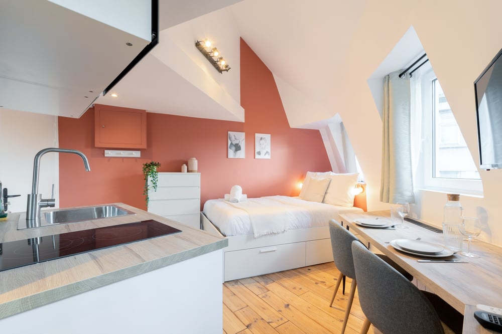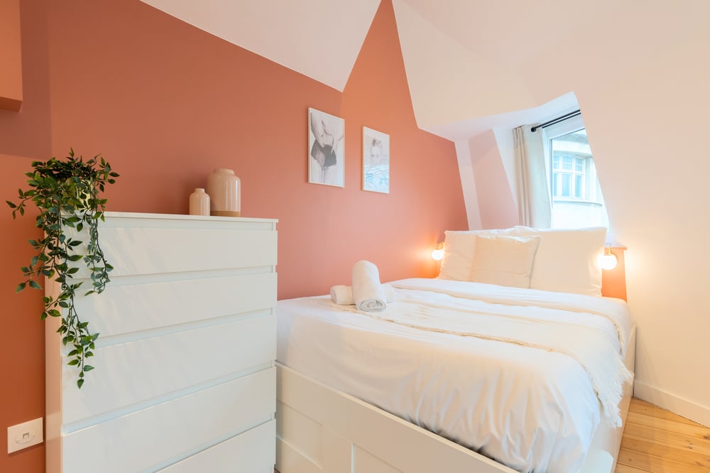 The apartment is located on rue Baptiste Monnoyer, on the fourth floor of a typical Lille building. The staircase to the apartment is typical of our pretty Lille buildings: the stairs are narrow, so we recommend that families with young children or people with mobility difficulties take this into consideration before booking. There is no elevator in this accommodation. The apartment comprises a living room with a small equipped area, a double bed (140 x 200) and an open-plan bathroom with shower cubicle, washbasin and WC. The apartment will be carefully prepared for your arrival: Professional cleaning service + laundry service for household linen. All linen is provided: bed sheets, bath towels, bath mats and tea towels. The kitchen is equipped with all utensils and crockery for lunch and dinner. Entertainment available via TV: Molotov TV, Prime Video! As the neighborhood is quite lively, we advise light sleepers to bring earplugs!