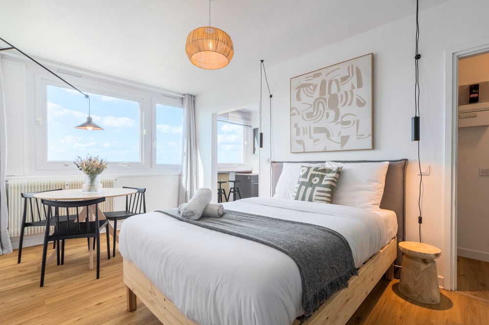 The apartment is located on Rue Roger Salengro, on the tenth floor of a secure residence (with elevator), with access to the entire unit and a private parking space. It comprises a living room with bedroom area, a fully-equipped kitchen and a bathroom. You'll love the unique view from the apartment! The apartment is comfortable and well-kept. You'll appreciate its atmosphere For those who are sensitive to light, we recommend that you take your night mask. The apartment will be carefully prepared for your arrival: Professional cleaning service + laundry service for household linen. All linen is provided: bed linen, bath towels, bath mats and tea towels. The kitchen is equipped with all utensils and dishes for breakfast and dinner. Entertainment available via TV: Molotov TV and Prime Video.