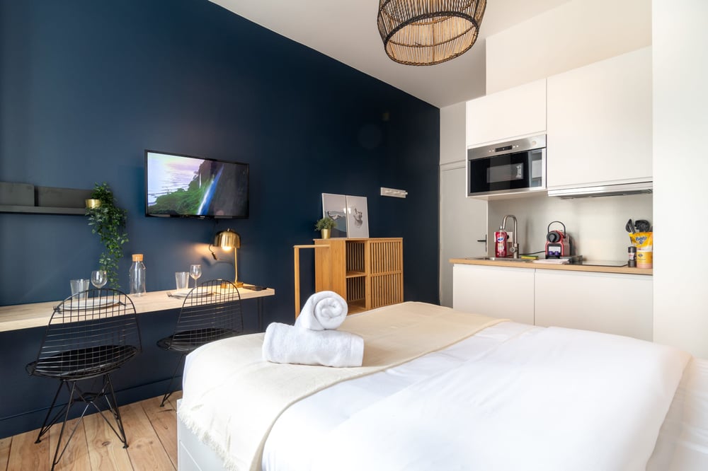 The flat is a studio located on Rue Baptiste Monnoyer on the second floor (no lift) of a typical Lille building: it comprises a single living room with a real 140 x 200 double bed, a dining area/study and small fitted kitchen and a bathroom with shower and WC. You'll love this practical short-stay accommodation right next to the centre of Lille, ideal for couples, singles and business travellers. The flat will be carefully prepared for your arrival: Professional cleaning service + laundry service for household linen. All linen is provided: bed linen, bath towels, bath mats and tea towels. The kitchen is equipped with all utensils and dishes for lunch and dinner. Entertainment available via TV: Molotov TV, Prime Video! The neighbourhood is quite lively, so for light sleepers, we advise you to bring your earplugs!