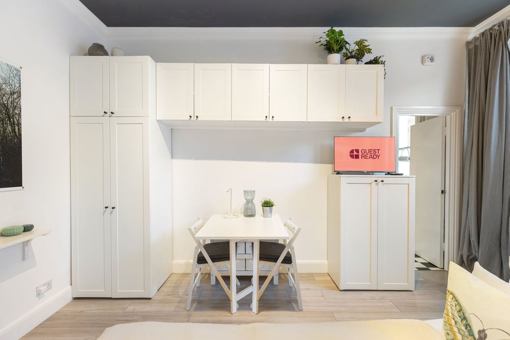 Welcome to your cozy retreat in Brook Green, London. This 29 sqm studio is perfect for two travellers, featuring a sunlit main room with a comfy bed and workspace, a fully equipped kitchen, and a modern bathroom with a bathtub. Enjoy the minimalist decor with botanical accents and ample storage, all in a vibrant neighbourhood.