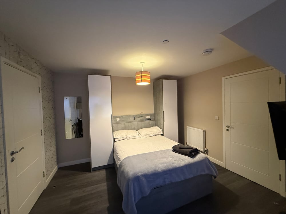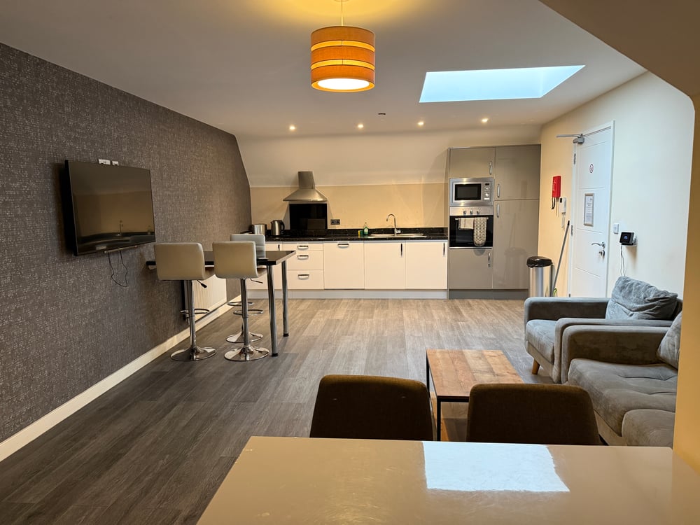 Step into a bright, open-plan living space designed for both comfort and ease. Relax on the comfortable sofa, catch up on your favourite programmes on the wall-mounted TV, or enjoy a meal together at the dining table. The contemporary kitchen is fitted with quality appliances and fully equipped with cookware and cutlery, making it easy to prepare anything from a quick breakfast to a full evening meal. Unwind in one of the three inviting bedrooms, each featuring a cosy double bed and a charming sloped ceiling that adds character to the space. The stylish bathroom features a modern shower and ample storage for your toiletries. Complimentary WiFi is available throughout the apartment, ideal for streaming, browsing or keeping up with work.