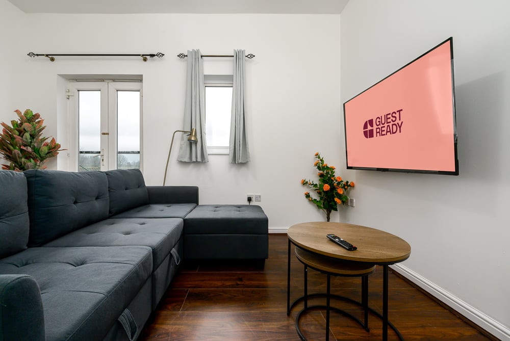 Welcome to our cosy two-bedroom apartment perfect for four travellers. Enjoy a modern living space with a sectional sofa, a TV, and a fully equipped kitchen. The dining area is ideal for intimate meals. Relax in the bathroom's bathtub after a day exploring nearby attractions. Experience the comfort of home with all essential amenities included.