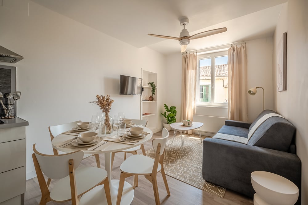 Olympe • A 33 m² apartment with soft, elegant decor, recently renovated. Ideally located in the heart of Narbonne, just steps from Les Halles and the canal. Nestled on the 2nd floor (no elevator), it’s perfect for exploring the city on foot. Whether as a couple or with family, enjoy an unforgettable stay at the vibrant center of town.
