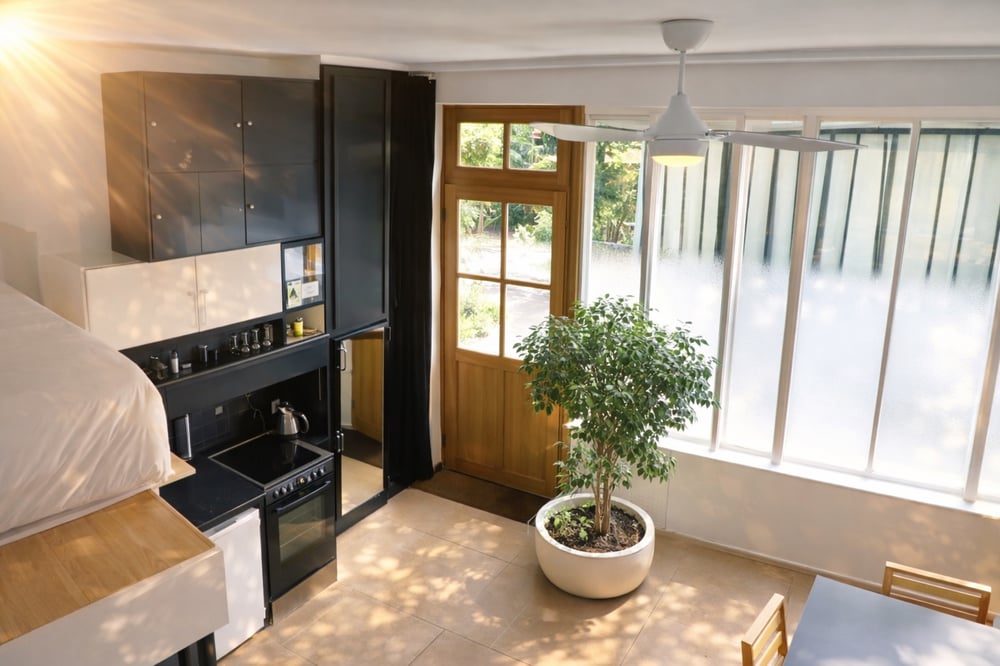 You can also enjoy a terrace area in the courtyard in front of the workshop, with its beautiful flowers. Ideal for morning coffee and aperitifs! When you arrive, you'll be greeted by the housekeeper, who'll make sure your stay goes smoothly in my absence: handing over the keys, professional cleaning and assistance if you need it.