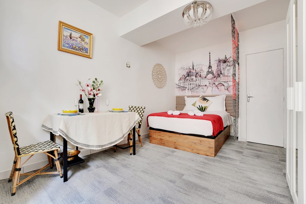 Welcome to my studio! Situated on the 2nd floor without a lift, this modern and tastefully decorated 25m² apartment is close to various top attractions in Paris, such as Sainte-Chapelle and Notre Dame! This studio is designed with open living and dining areas. The living space features a comfortable queen bed with complimentary hotel-quality linens for maximum comfort, a table for two people, and a TV for entertainment. The kitchen is fully equipped with essential cookware and cutlery, including a stove, an oven, and a microwave, to prepare delicious meals. The bathroom contains all the essentials for your convenience, including a shower, towels, and complimentary toiletries. For your safety, a smoke detector is available in the apartment. The studio is always professionally cleaned for your comfort. Enjoy your stay!