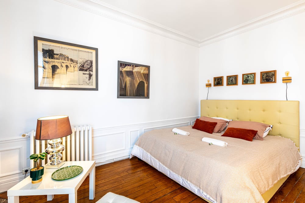 Welcome! Discover our spacious and comfortable 75 m² apartment, spread across two floors. Ideally located in the heart of the capital, it is on a quiet street while still benefiting from the vibrancy of the neighborhood. The apartment is on the 2nd floor (with elevator). The bright and spacious living room is equipped with a television offering unlimited access to national channels. You can relax on the comfortable sofa or enjoy a meal together around the dining table. The dining area features a table that can seat up to four guests. The fully equipped kitchen allows you to prepare delicious meals with family or friends. It includes an oven, refrigerator, kettle, dishwasher, toaster, and a Nespresso machine with classic capsules. The two bedrooms are furnished with high-quality beds: one with a King-size bed (180 x 200 cm) and the other with a Queen-size bed (160 x 200 cm). The bed linens, carefully selected, are of hotel quality. The bathroom includes a spacious Italian-style shower, separate toilets, and a hairdryer for your convenience. For your comfort, the property is secured with a smoke detector. You will also have access to a washer, dryer, iron, and ironing board. We provide hotel-quality bed linens and towels. In addition, the property is regularly cleaned by professionals to ensure you have the most pleasant stay. WiFi is available throughout your stay. Please note that the property is not suitable for guests with reduced mobility. Book now to experience an unforgettable Parisian getaway!