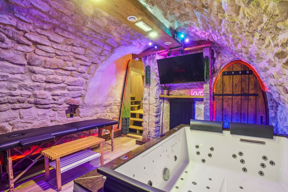 A unique love room on two levels, with a jacuzzi, hammam, sauna and massage table, for a romantic break in the heart of Paris.
