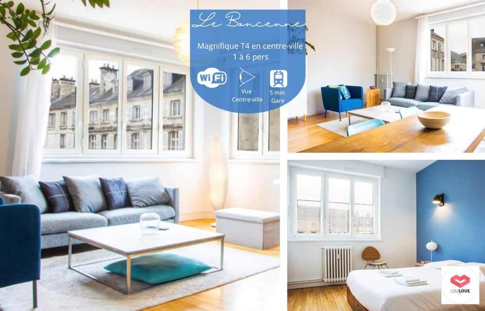 Discover this superb 100m² apartment, located on the second floor of a beautiful building in the historic center of Poitiers. The apartment offers a superb, unobstructed view of the city's historic district, the Place de l'Ancien Tribunal and the streets of the city center. Despite its central location, the apartment is very quiet and incredibly bright. The apartment features a private entrance with plenty of storage space, opening onto a modern, fully-equipped open kitchen (Nespresso coffee machine, kettle, oven, microwave, etc.). It features a spacious, cozy living room with dining area and large flat-screen TV. The apartment also has 3 bedrooms and a shower room. All the necessary comforts are provided on site, as are household linen (sheets, covers, towels, etc.). All you have to do is put down your suitcases and enjoy your stay with family or friends!