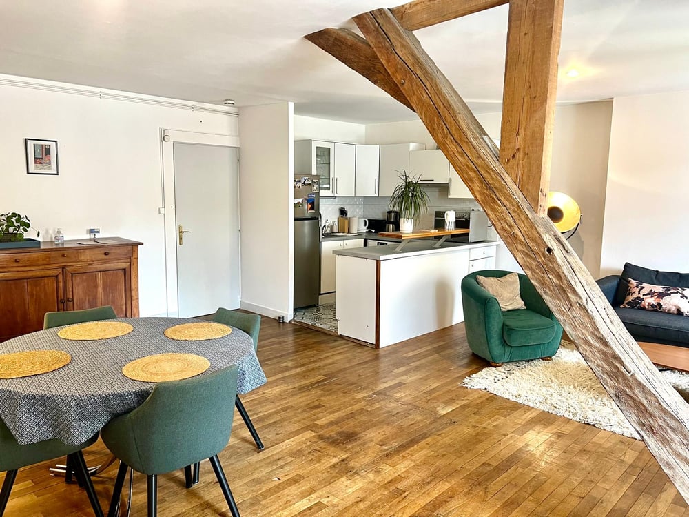 The apartment is luminous with a large living area and an open kitchen. There is a superb original parquet flooring. There are two bedrooms with double beds and a very practical bathroom. One of the bedroom is equiped with a desk and two screens. Everything need to work from home. There are a washing machine and a dryer in a room separated from the flat for which you will have the keys.