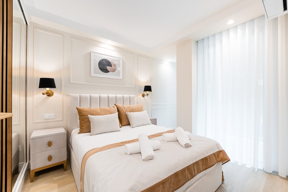 Welcome to my home! This beautiful 50m² apartment is tastefully decorated and ideally located near top attractions, shops, supermarkets, and various restaurants offering diverse culinary options. The apartment is located on the 1st floor and is accessible by elevator. The living room is bright and inviting. It features a comfortable, relaxing sofa, a large-screen TV for your favourite shows, and a dining table. Oversized windows flood the room with natural light, enhancing the homely atmosphere. The living area also provides access to a balcony. The fully equipped kitchen includes all the essentials for preparing delicious meals, such as an electric hob, oven, microwave, and coffee machine. You'll also find cookware, cutlery, and a washing machine for your convenience. The bedroom offers a peaceful retreat with a queen bed, wardrobe, and chest of drawers. It also opens onto a balcony, perfect for unwinding and enjoying the fresh air. Complimentary hotel-quality linens ensure a restful night's sleep. The bathroom has everything you need to refresh, including fresh towels and toiletries. For your comfort, the space is professionally cleaned before your arrival. Due to its central location, it is possible that occasional noise from nearby construction may be heard. Enjoy your stay!