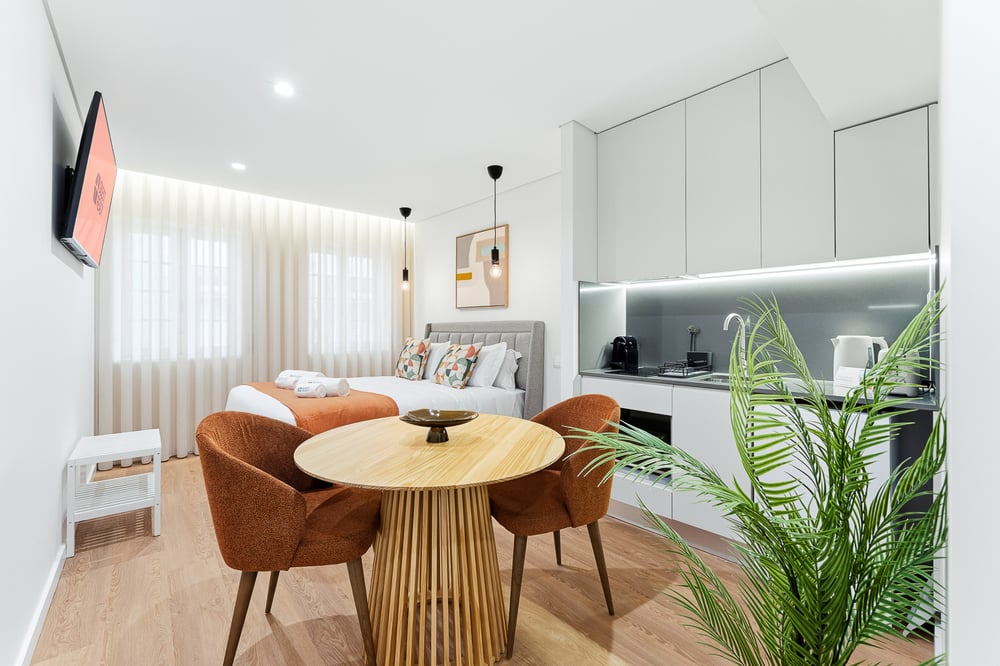 Welcome to our studio! Step into a welcoming haven featuring a comfortable queen bed where you can unwind after a day exploring Porto. The soft linens and plush pillows promise a restful night's sleep. Adjacent to the sleeping area, you'll find a quaint dining setup with a table and two chairs. It’s the perfect spot for a morning coffee or a romantic dinner, prepared in the fully equipped kitchen with all the necessary cooking utensils and cutlery at your fingertips. The bathroom is compact yet functional, offering a refreshing shower, plush towels, and essential toiletries. Enjoy the convenience of modern amenities, including heating and air conditioning, which ensure comfort in every season. Thinking of your comfort, we provide fluffy towels and high-quality bedding. NOTE: You must take stairs to access the apartment