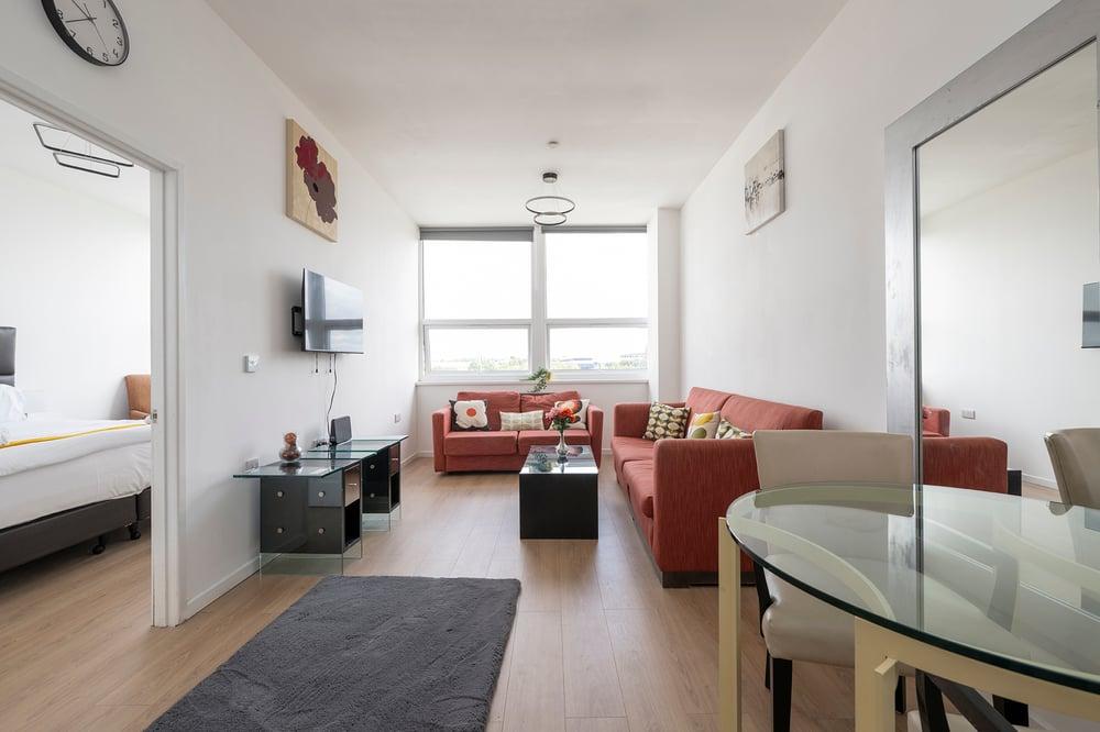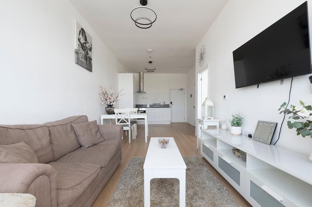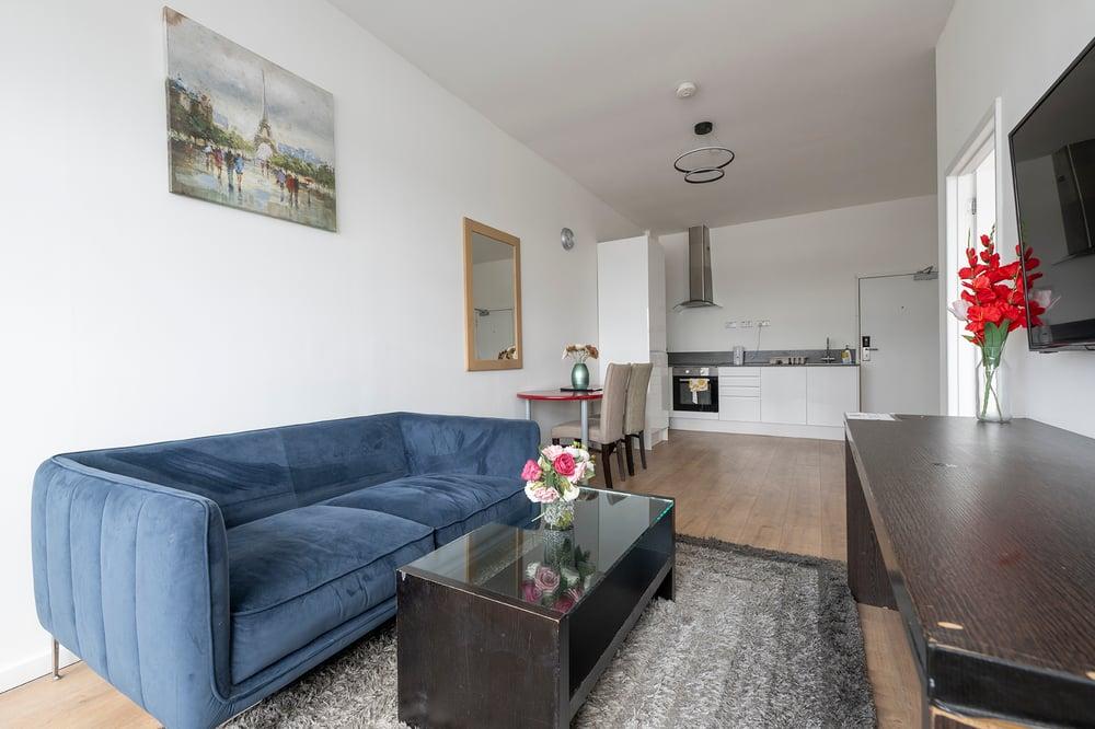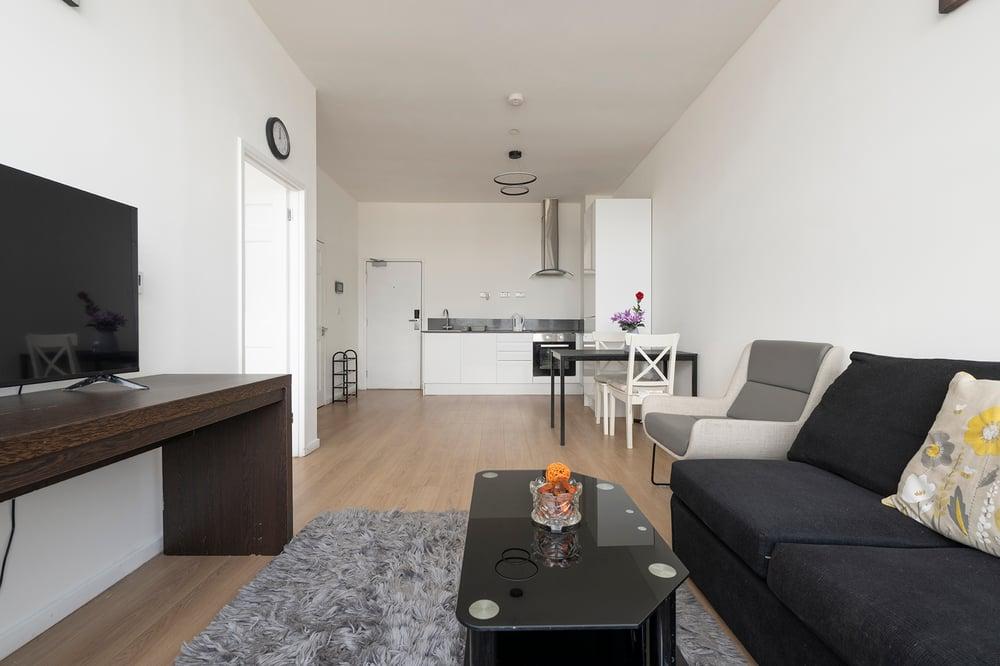 Welcome! The living room is comfortably furnished with a sitting area, a smart TV for enjoying your favourite shows, and a dining table, making it an ideal space to unwind and spend quality time with your group. The sofa bed can accommodate two additional guests, perfect for families or small groups. The kitchen includes modern appliances as well as essential cookware and crockery that will fulfil any of your culinary requirements. There is also a washer available for your laundry needs. The bedroom has a double bed with hotel-quality linens to ensure a good night's sleep and ample storage space for your belongings. The bathroom has all the amenities you will need to freshen up, including stunning floor-to-ceiling tiles, a heated towel rack, fresh towels, and toiletries for your convenience. Additional amenities include complimentary WiFi, high-speed internet, and underfloor heating for added comfort. Paid on-site parking is also available. On the ground floor is a fully equipped communal gym that you will have free access to throughout your stay. Identification will be required prior to entry, and it must match the name of the person who booked the flat. The apartment is always professionally cleaned for your comfort. Enjoy your stay!
